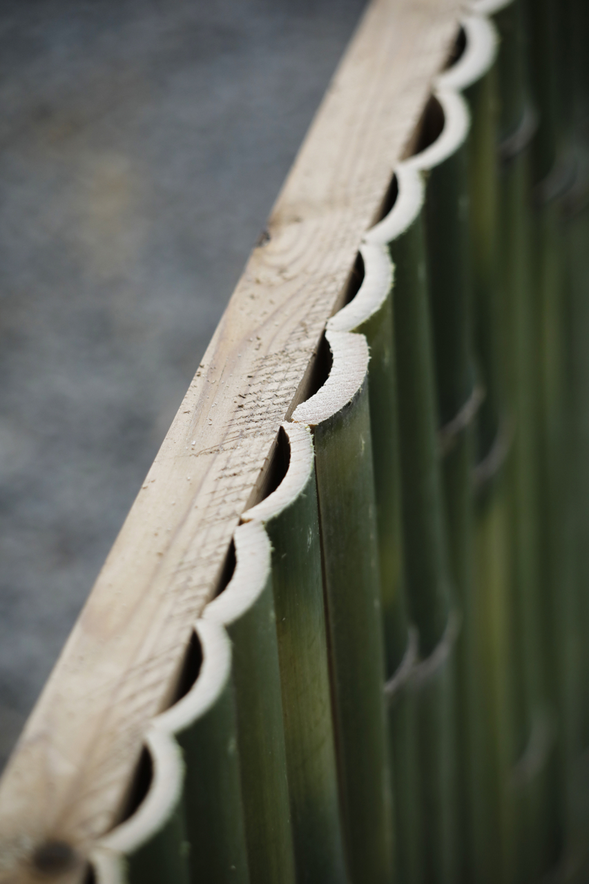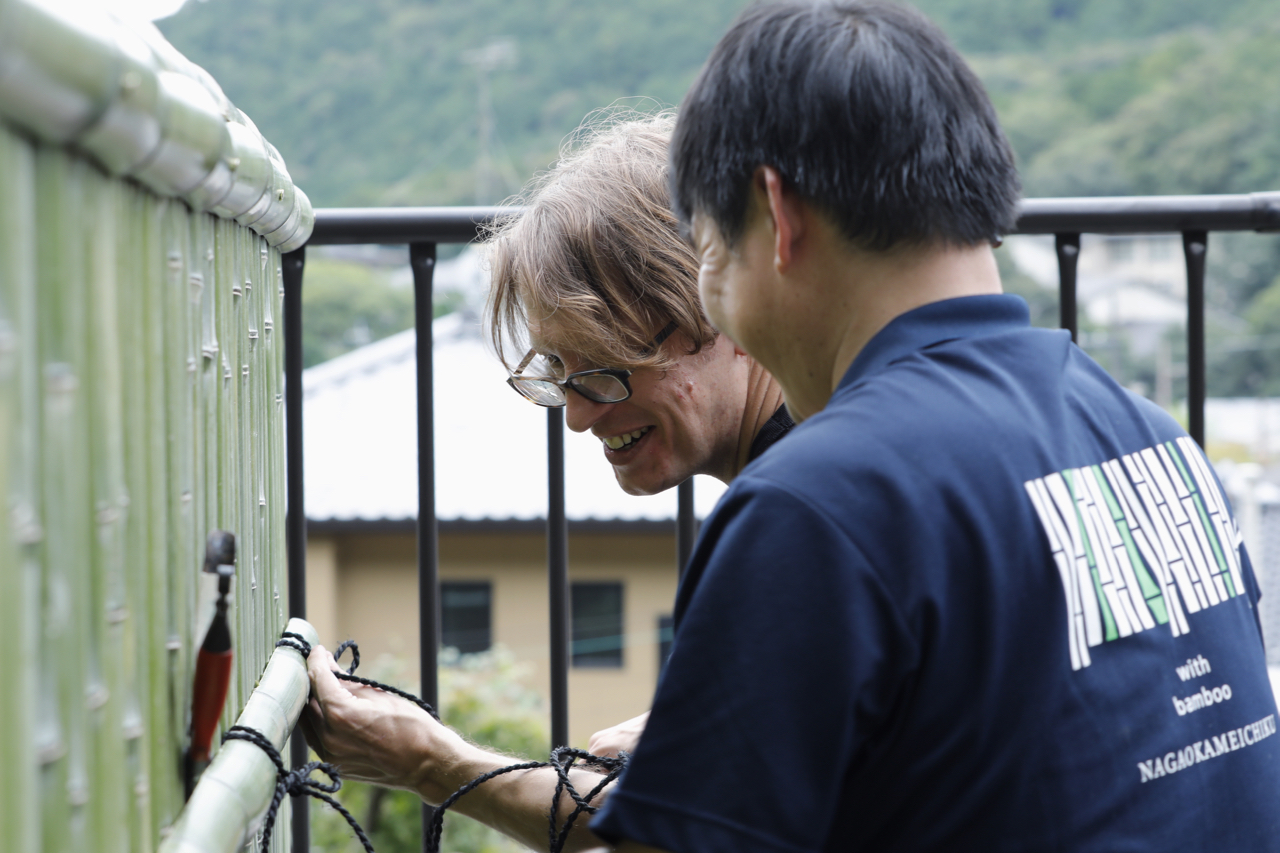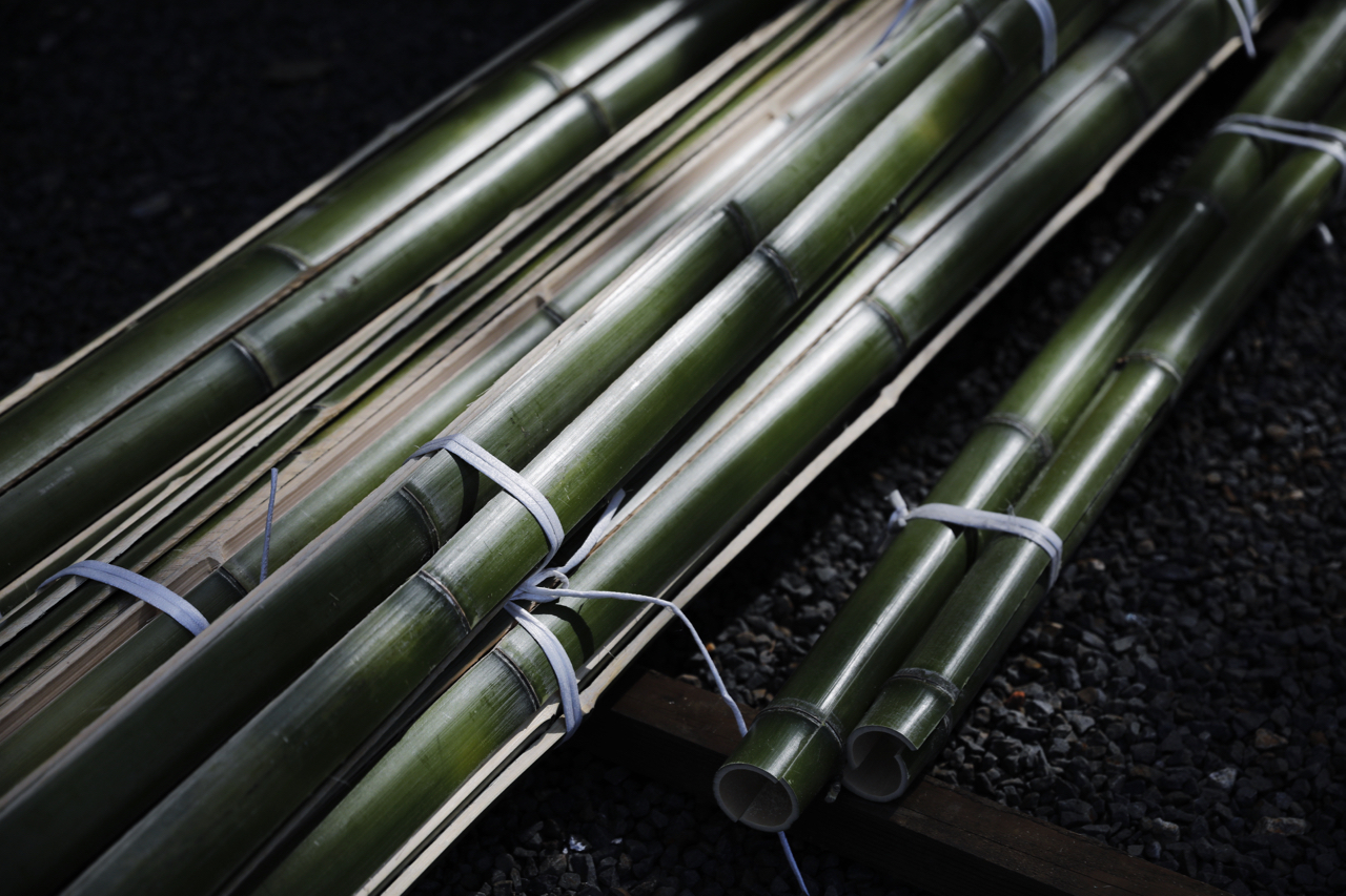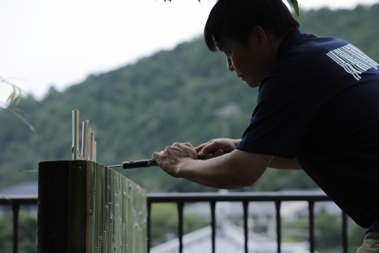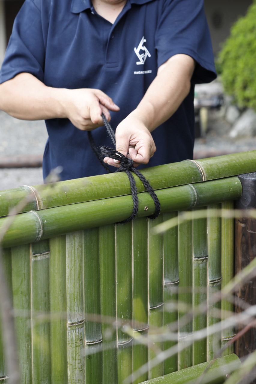 Nagaoka Meichiku, a bamboo specialist that designs and creats beatufiul bamboo fences that fit the space in an instant.Nagaoka Meichiku Corporation has a workshop by the river flowing through Kameoka City, Kyoto Prefecture. Nagaoka Meichiku is a group of craftspeople who make bamboo fences and other bamboo products in Kyoto, the center of bamboo culture. The company has gained a high reputation for their high level of techniques for handling bamboo and foresight in selecting quality bamboo, and has been involved in the production and restoration of bamboo fences for historical temples and shrines, such as the restoration of Katsura Rikyu's bamboo fence.