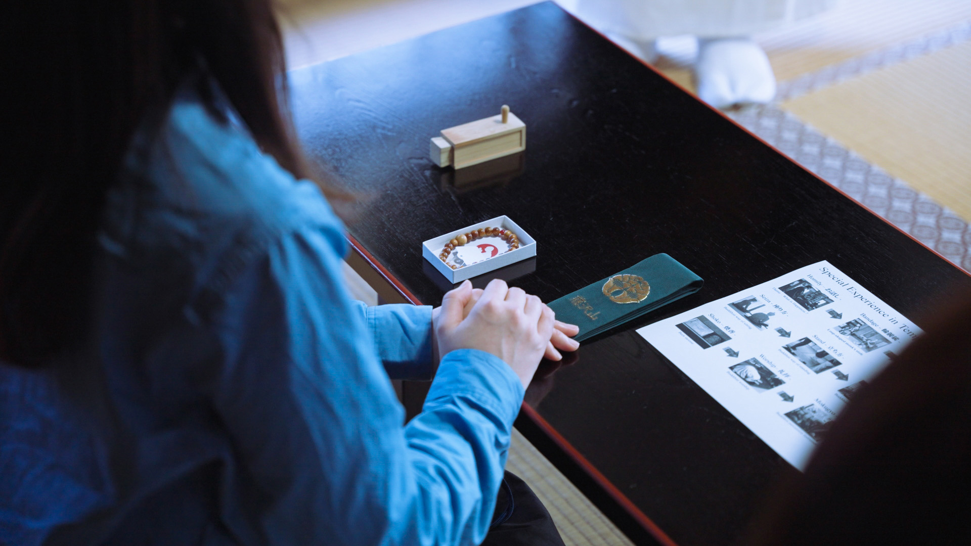 Additionally, after the prostration, you will have the opportunity to participate in a prayer experience while actually striking the wooden fish (mokugyo). We provide prayer beads that are used during the prostration, allowing you to choose your preferred set as a souvenir to take home after the experience. Following the experience, you will talk with the priest over a specially prepared tea, carefully chosen by the priest.