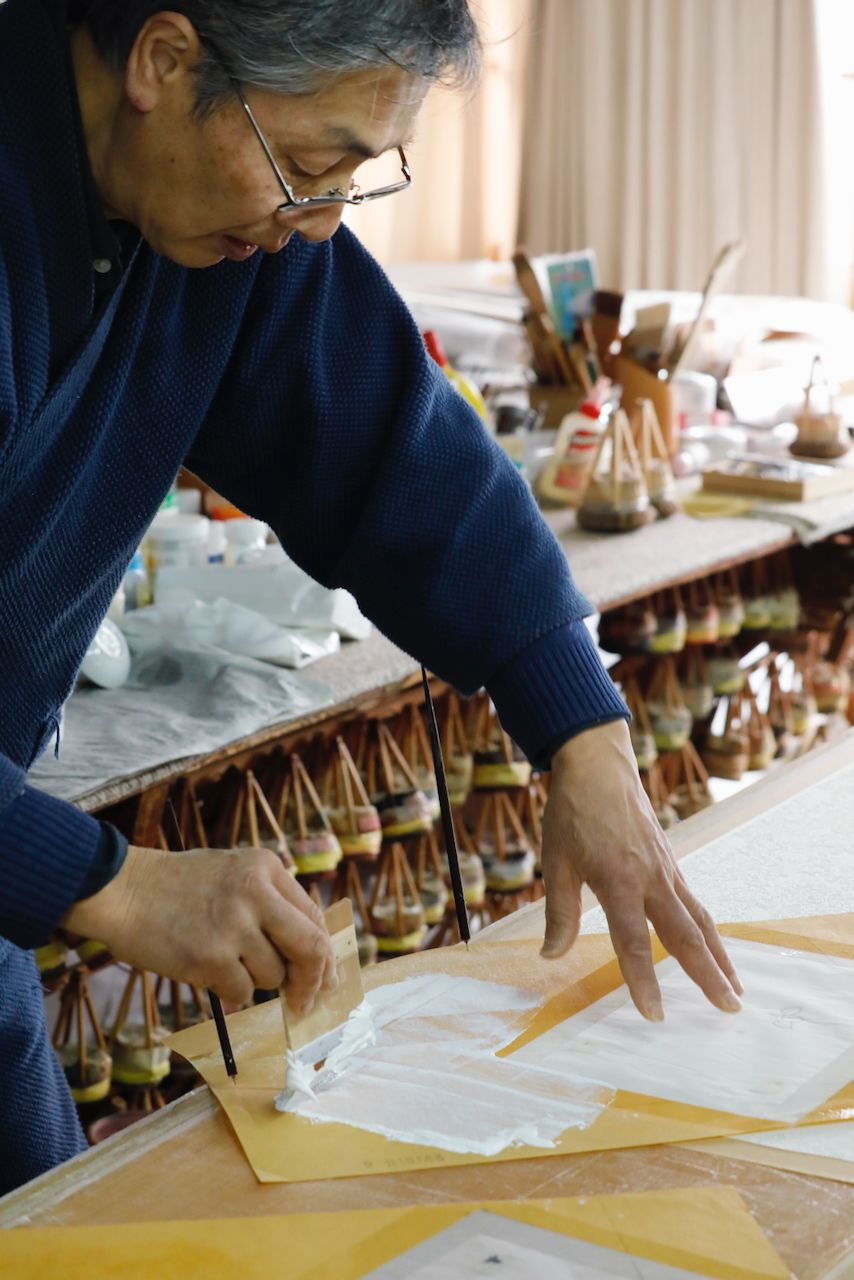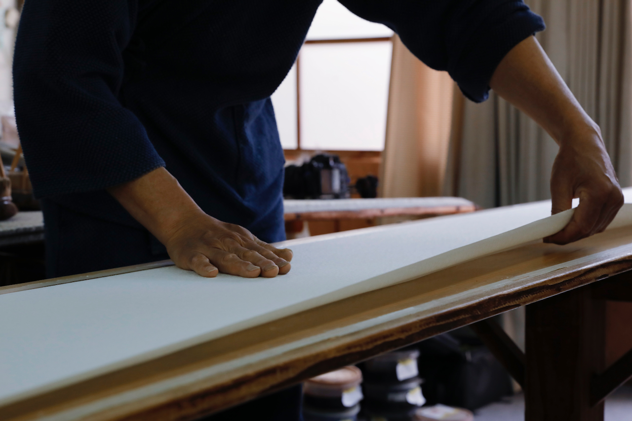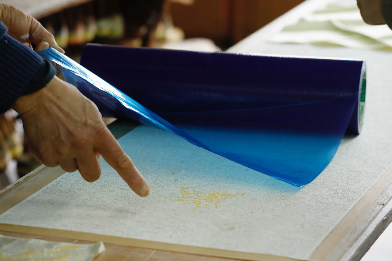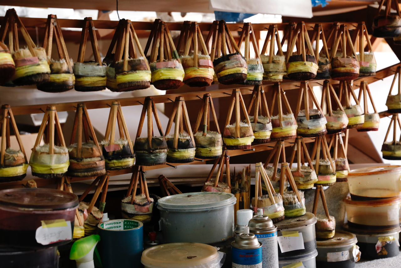 Nestled in a century-old Kyoto machiya, Mr. Kitamoto’s studio offers a rare glimpse into the world of traditional Kyoyuzen. Here, you’ll find tools and materials steeped in history — brushes of every size under the workbench, stencils suspended from the drying rack, and yuzen boards used for drying fabric with applied resist paste in the sunlight. The studio itself is a living museum of craftspersonship.