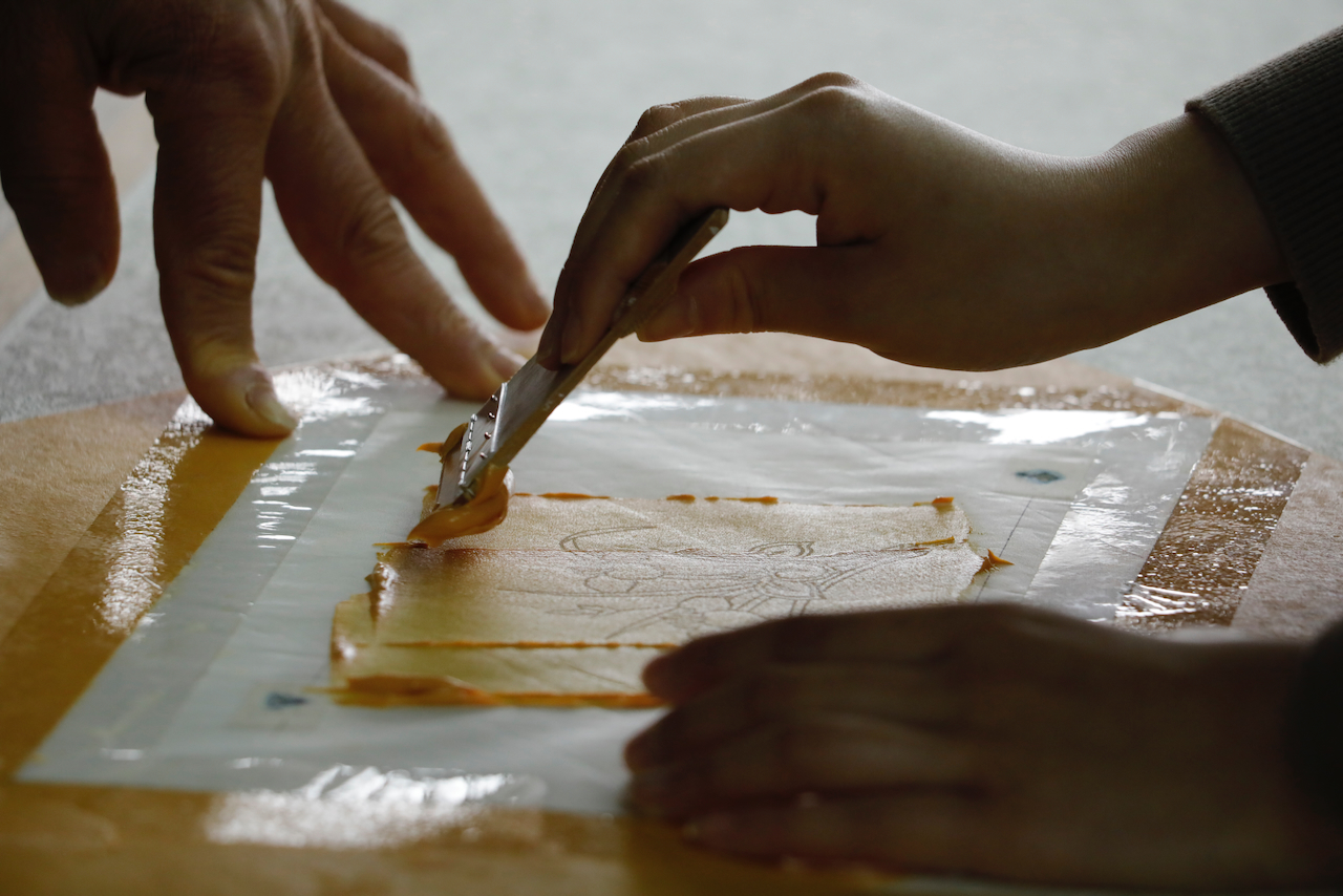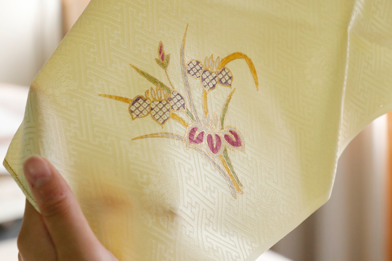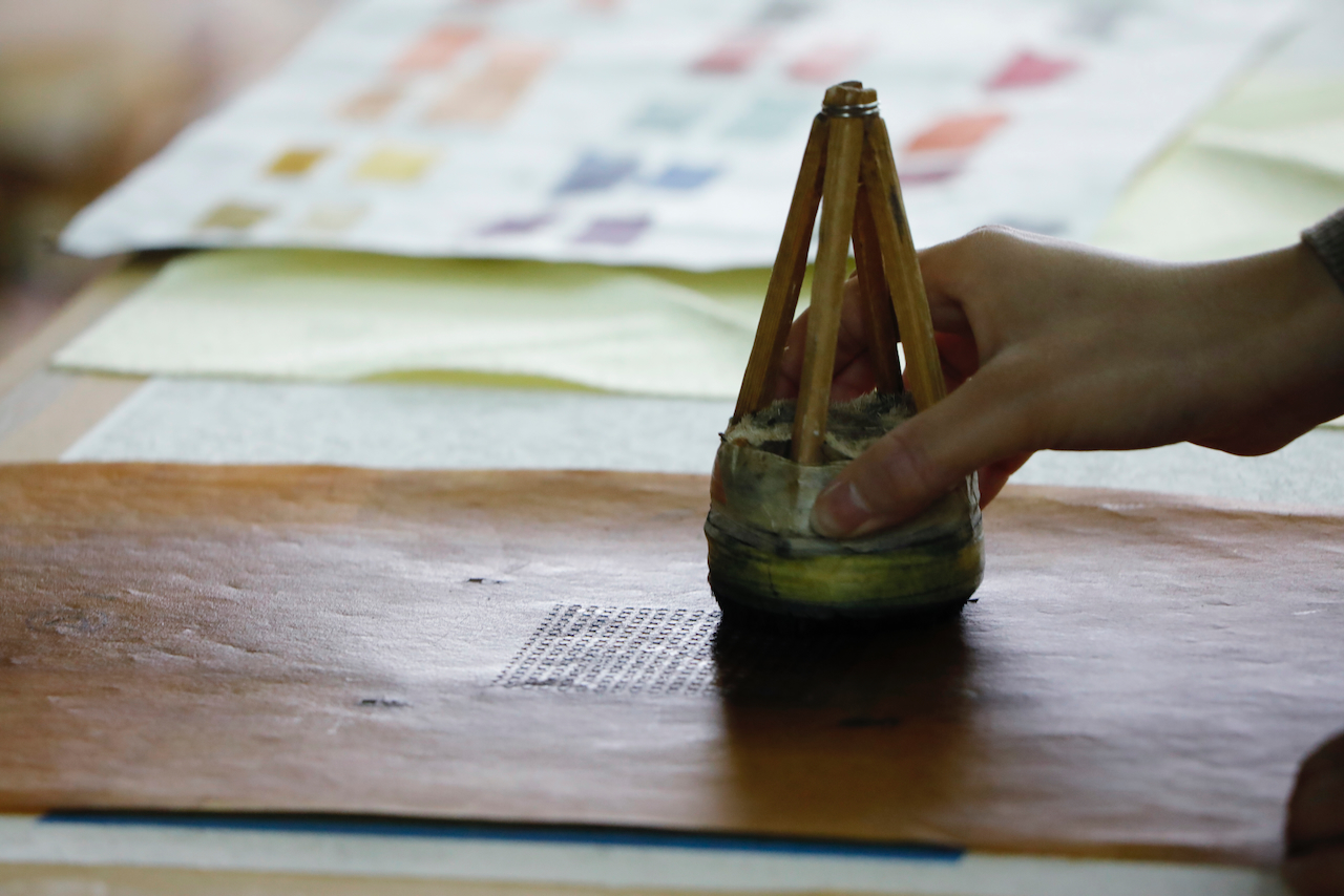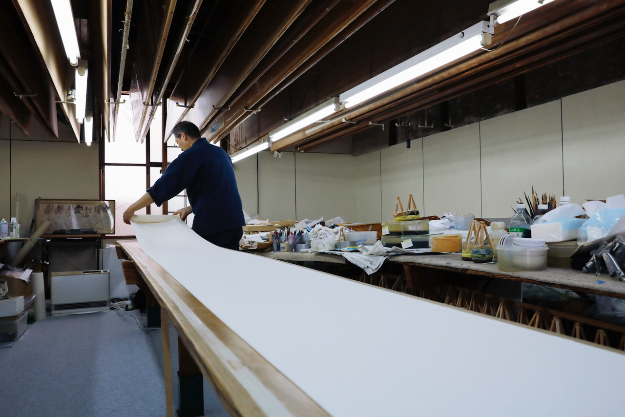 Nestled in a century-old Kyoto machiya, Mr. Kitamoto’s studio offers a rare glimpse into the world of traditional Kyoyuzen. Here, you’ll find tools and materials steeped in history — brushes of every size under the workbench, stencils suspended from the drying rack, and yuzen boards used for drying fabric with applied resist paste in the sunlight. The studio itself is a living museum of craftspersonship.