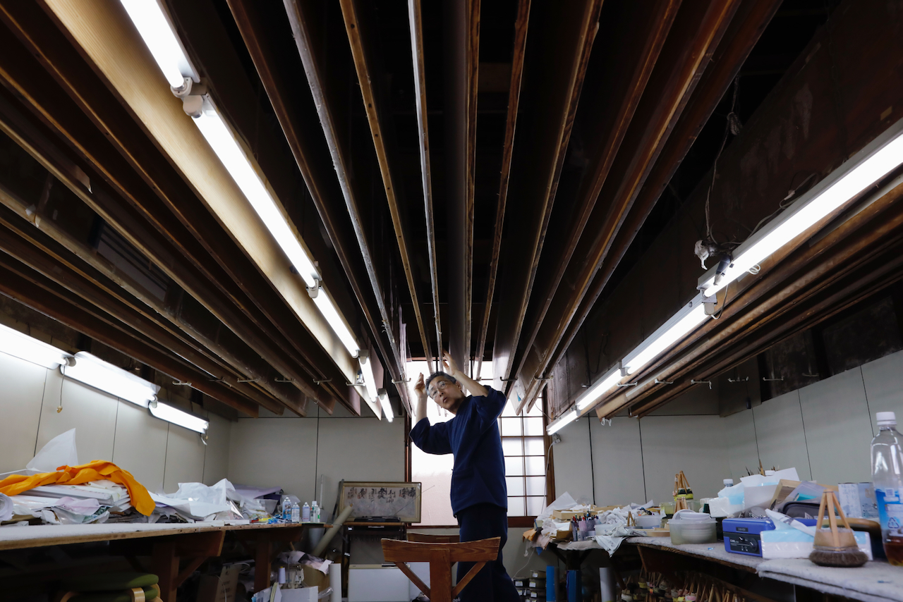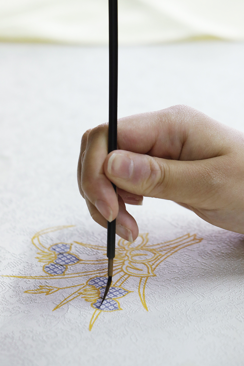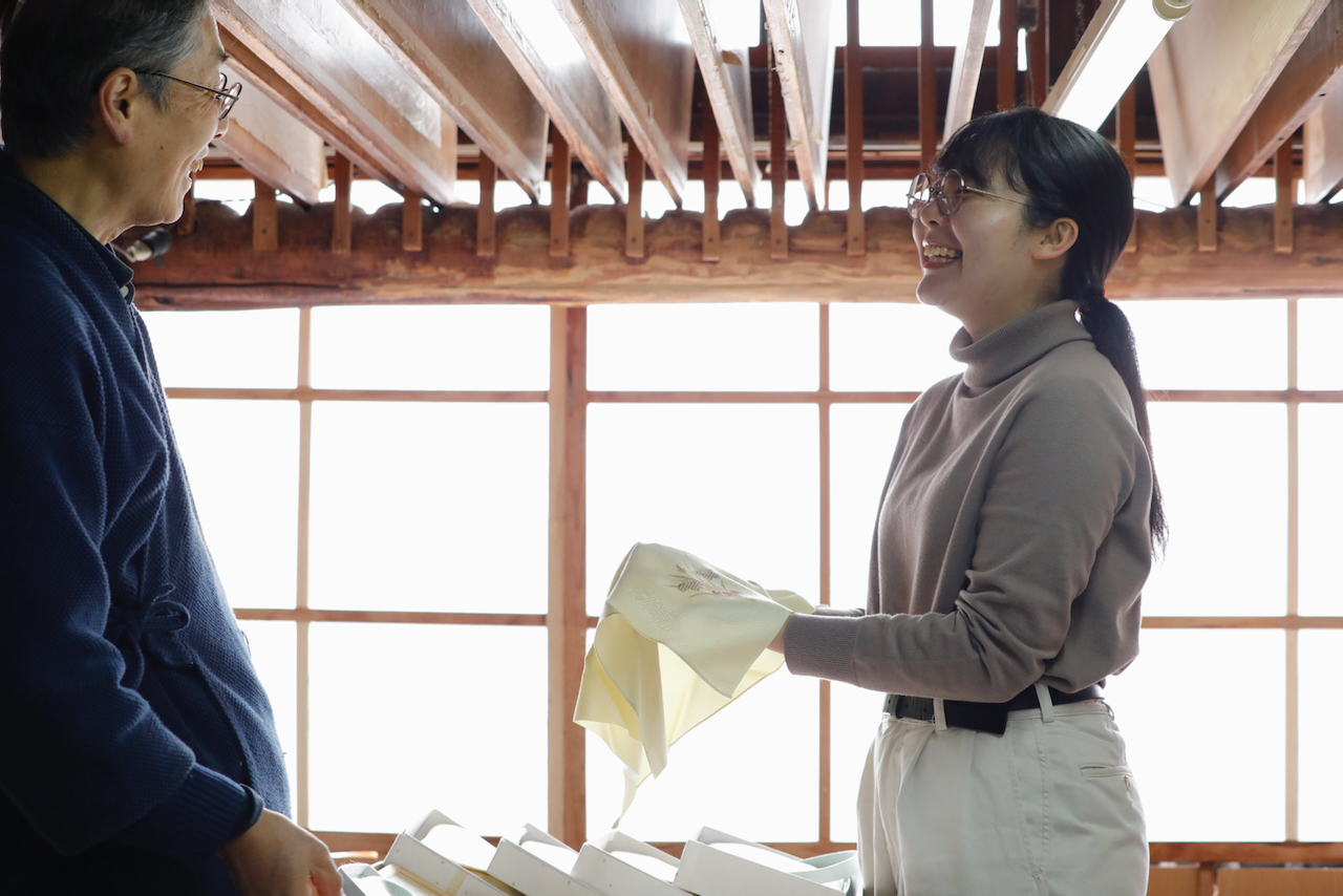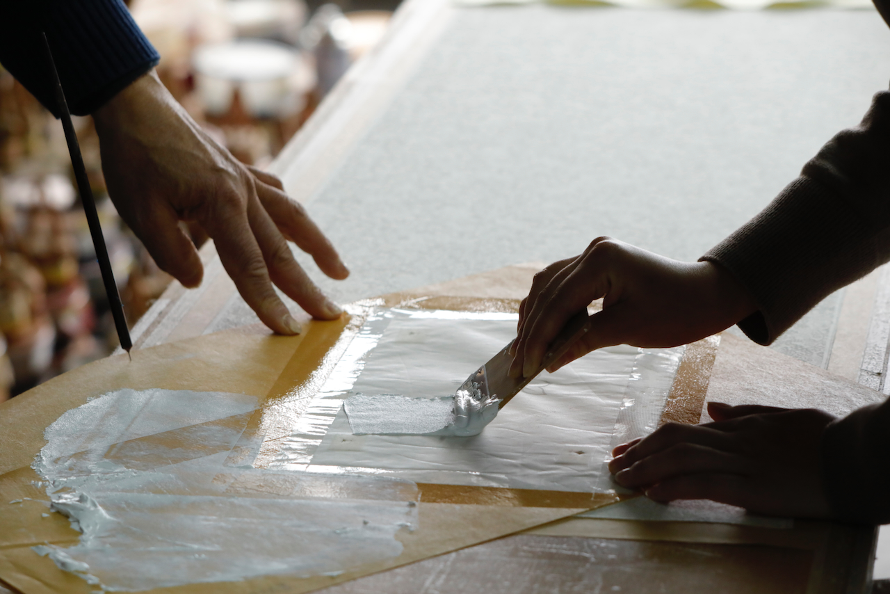 Nestled in a century-old Kyoto machiya, Mr. Kitamoto’s studio offers a rare glimpse into the world of traditional Kyoyuzen. Here, you’ll find tools and materials steeped in history — brushes of every size under the workbench, stencils suspended from the drying rack, and yuzen boards used for drying fabric with applied resist paste in the sunlight. The studio itself is a living museum of craftspersonship.