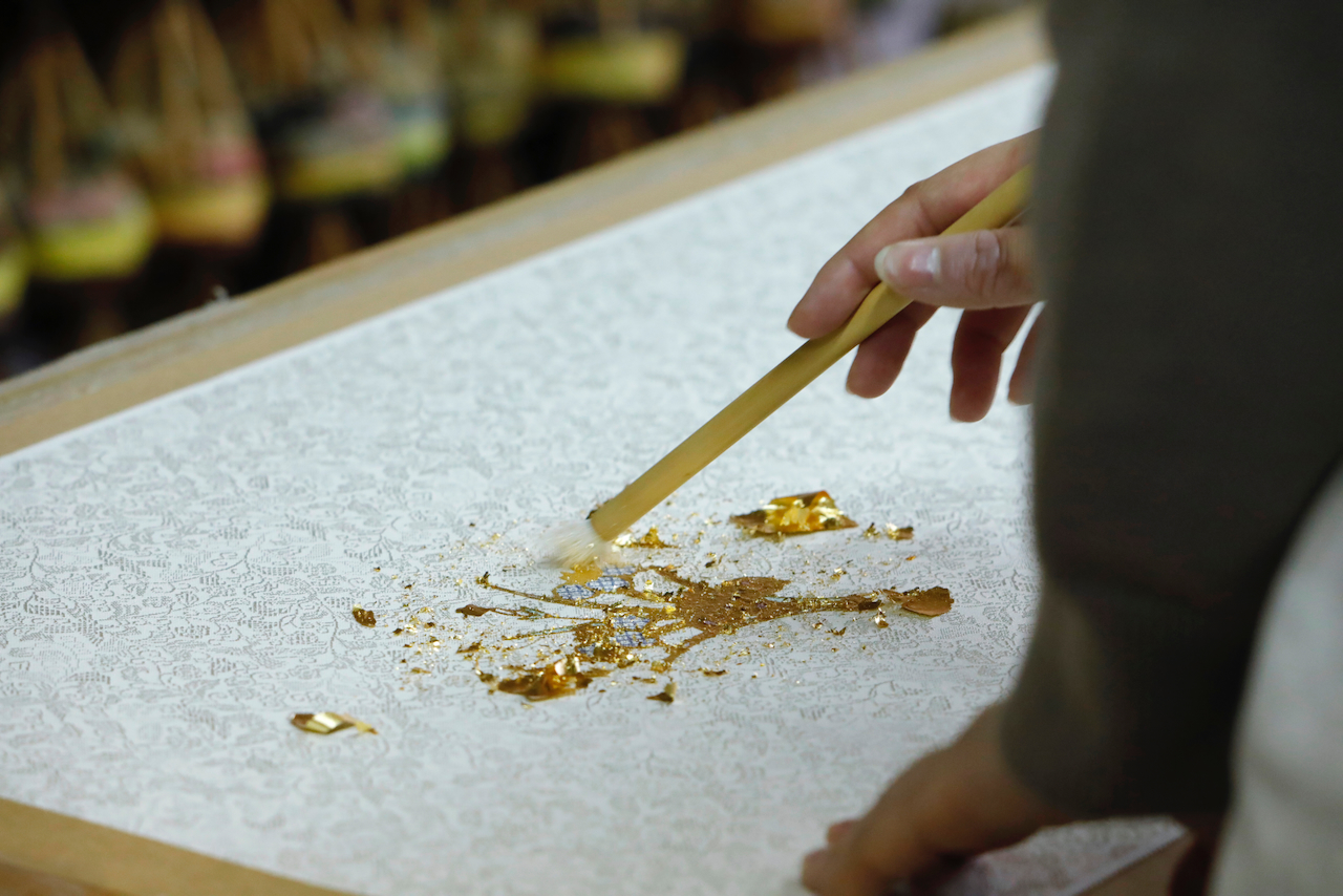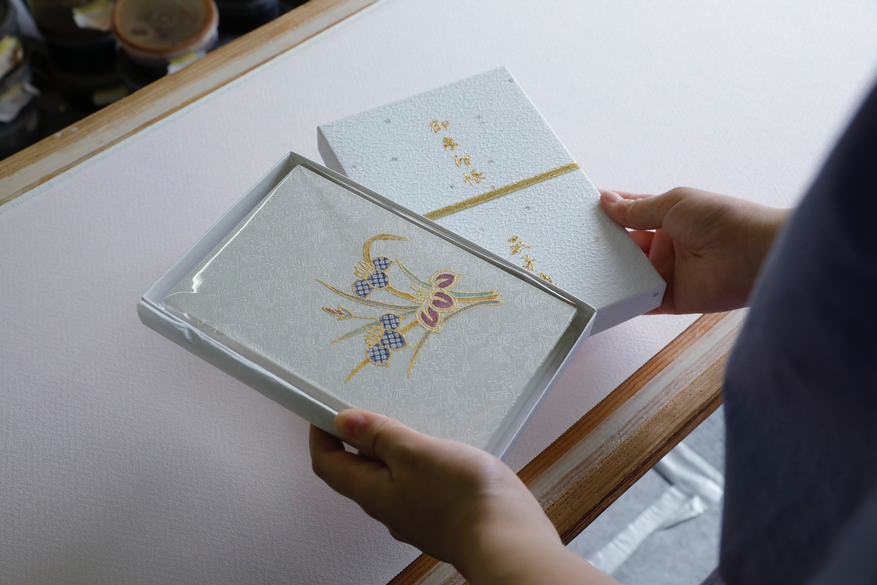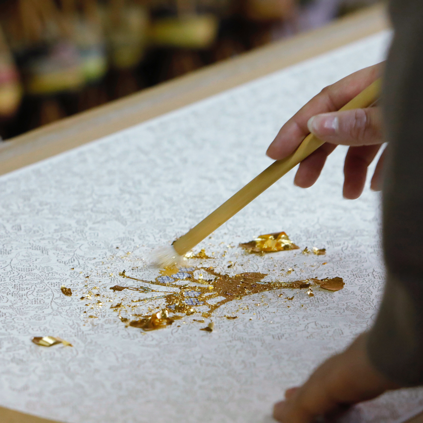 For the final flourish, your work will be adorned with high-quality kinpaku (gold leaf), adding a luxurious sheen to your creation. Whether you transform your fabric into a kinpu fukusa, sukiya bukuro (tea ceremony bags), goshuincho (stamp books), or even a decorative wrapping cloth, your piece will become a tangible memory of your journey into Japanese artistry. Optional upgrades include bags or pouches, ensuring your masterpiece is both beautiful and functional.