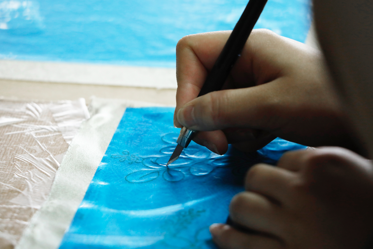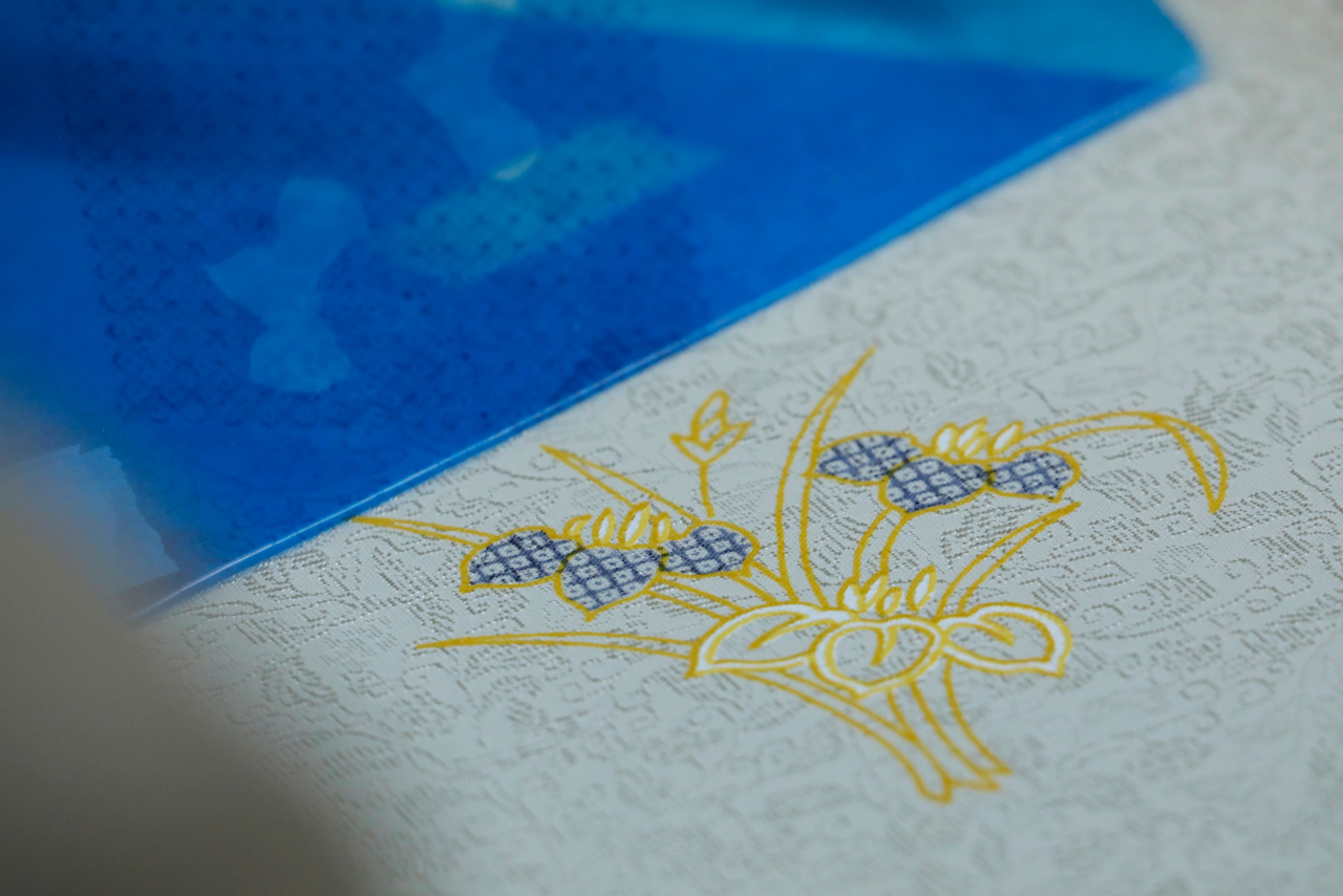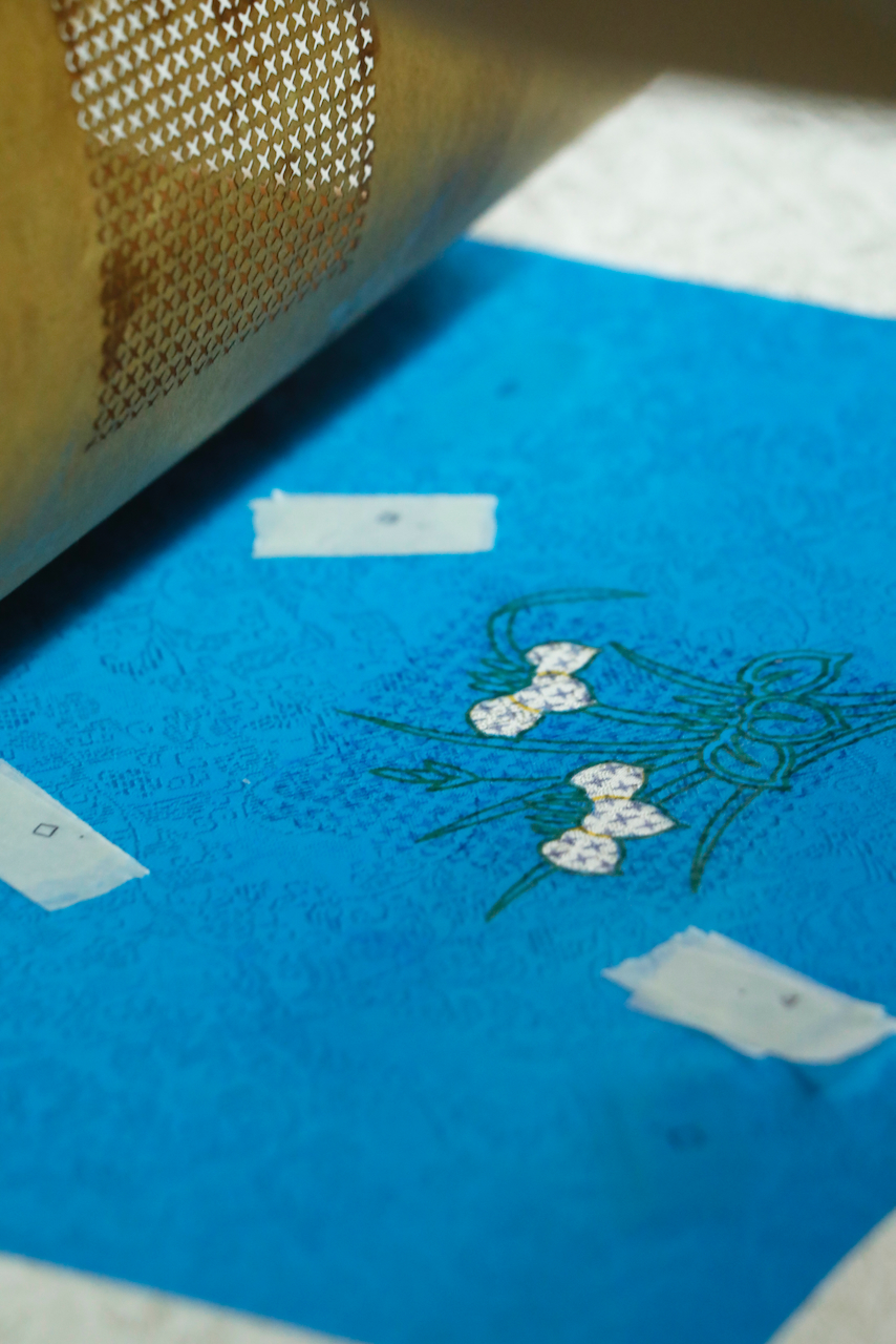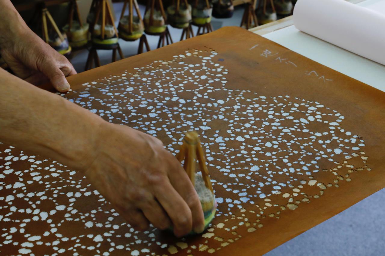 Kyoyuzen originated during the Edo period, developed by fan painter Miyazaki Yuzensai. This dyeing technique allowed for the creation of rich colors and intricate, painterly designs on kimonos, which were not possible with previous methods. Mr. Kitamoto specializes in a stencil dyeing technique known as Suribitta, which uses stencils to recreate the delicate, fawn's-coat-like patterns of Kanoko Shibori — a traditional tie-dye method. The process involves rubbing dye through a stencil with a brush to transfer the design onto the fabric.