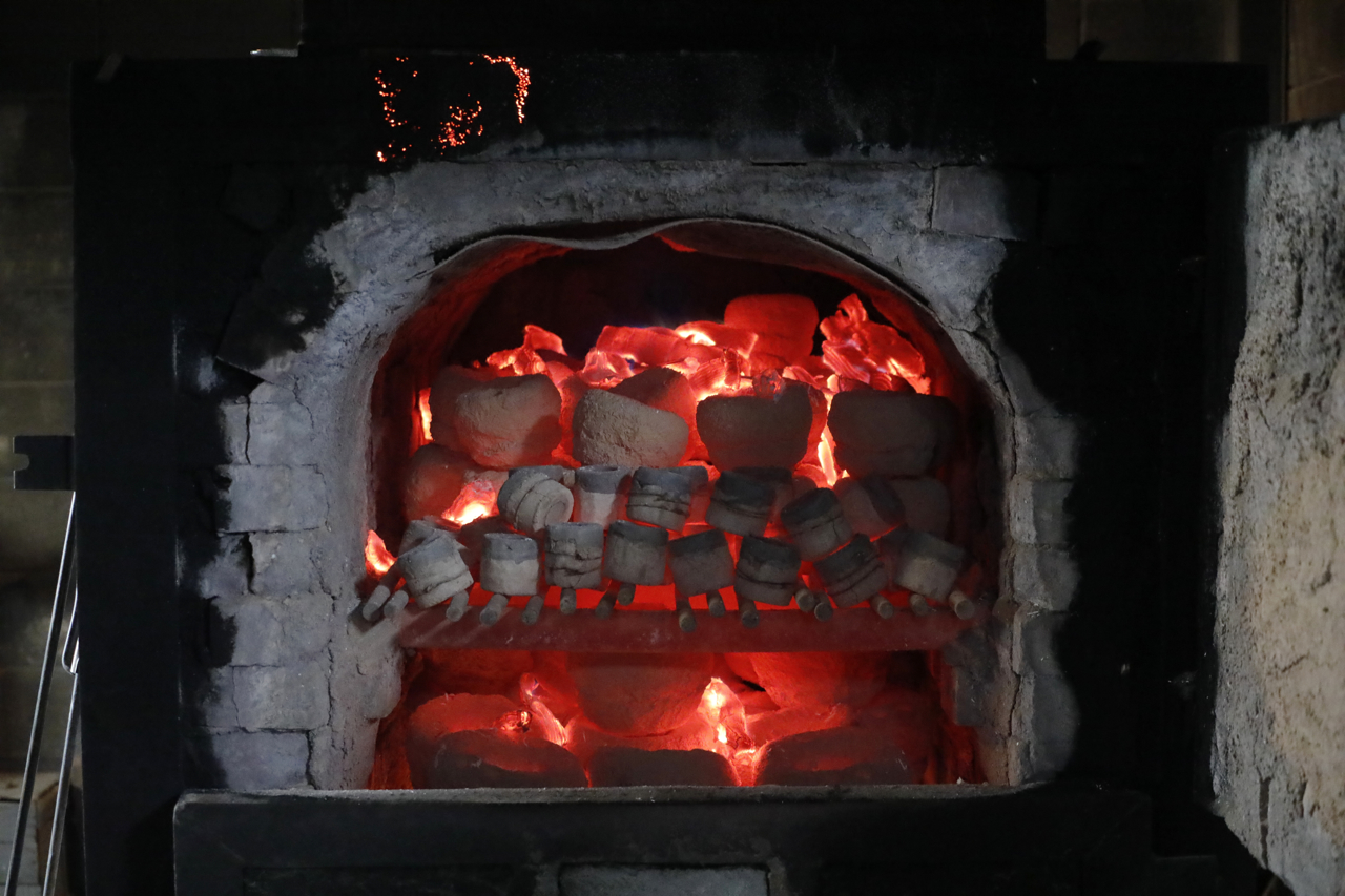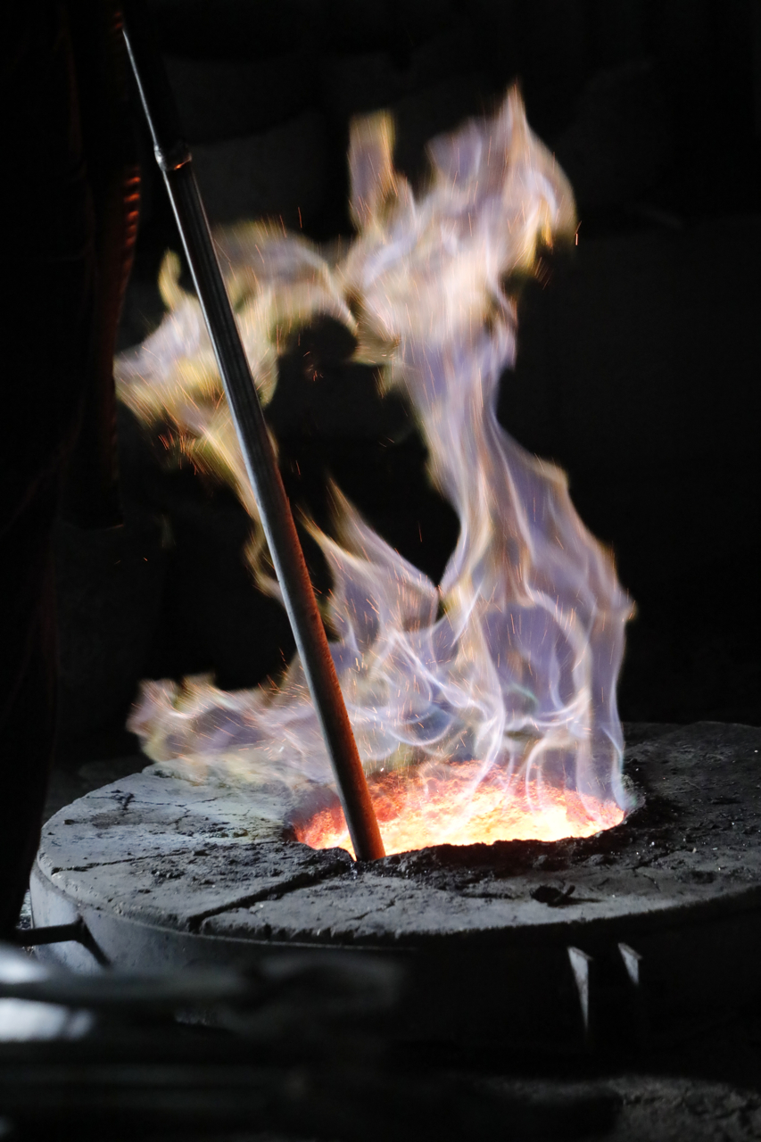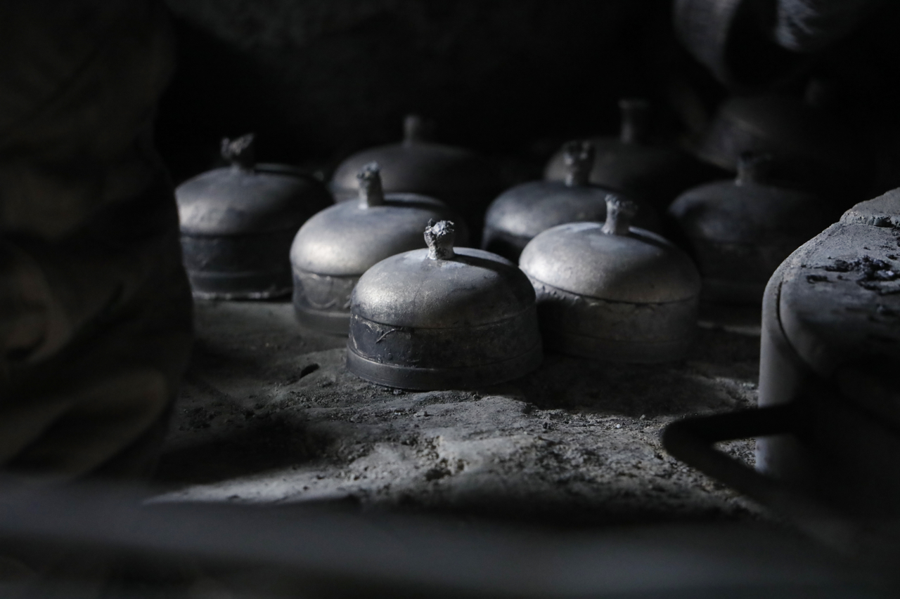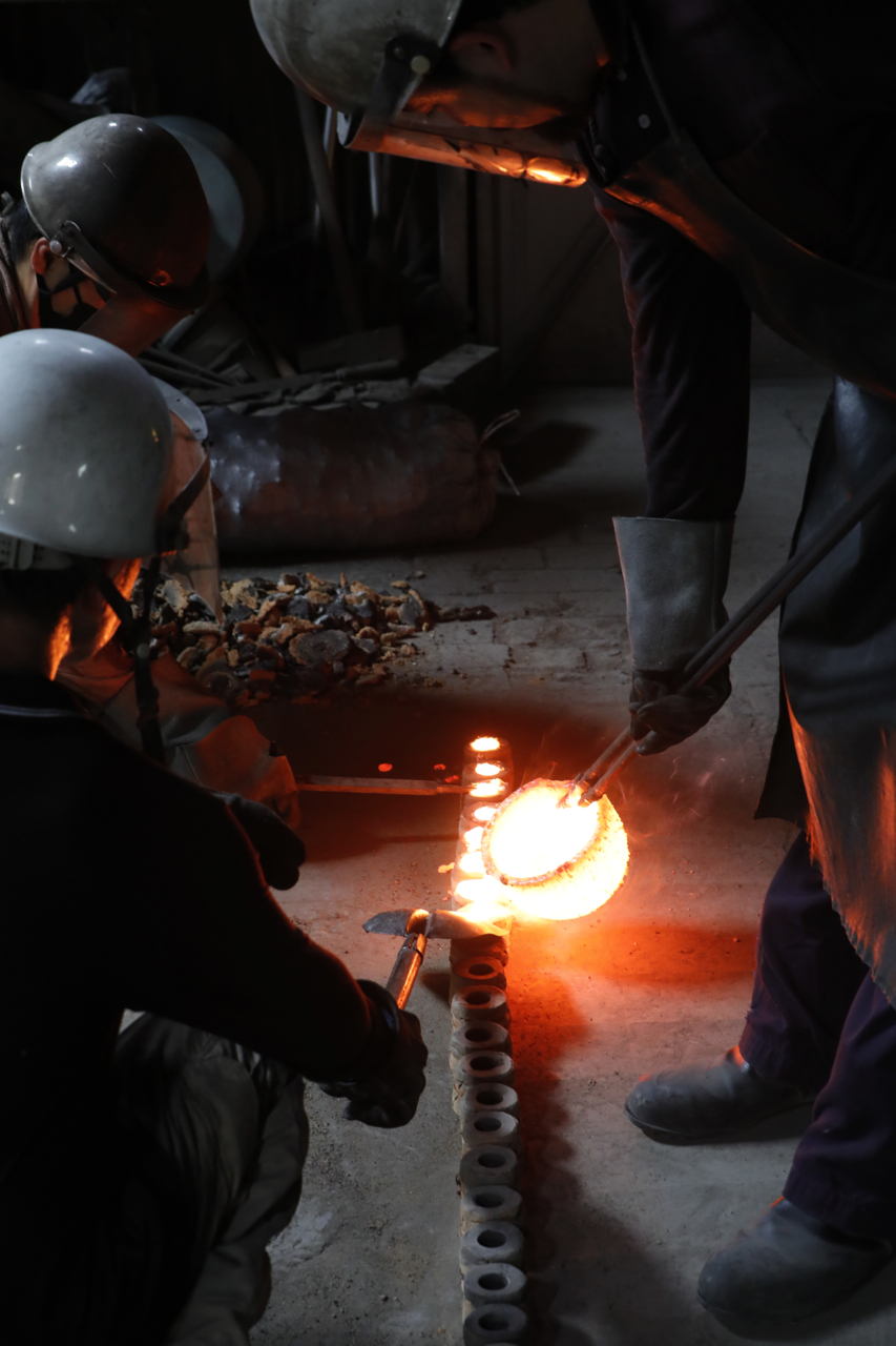The studio uses 'Yakigata (burnt-mold) casting,' a traditional wood-fired method to cast its own unique blend of Sahari. In Yakigata casting, handmade clay molds are placed in a kiln, fired over a wood fire, cooled down to an appropriate temperature and then filled with molten Sahari. The temperature and the timing of all the processes are determined by the experience and intuition of the craftspeople who carry out each step in the scorching heat. The reason for the long and painstaking preservation of the traditional method is that the traditional wood-fired Yakigata casting method is considered to be the most suitable for casting Sahari. The studio has a pride and belief in creating unique sounds that reach deep into people's hearts and minds.
