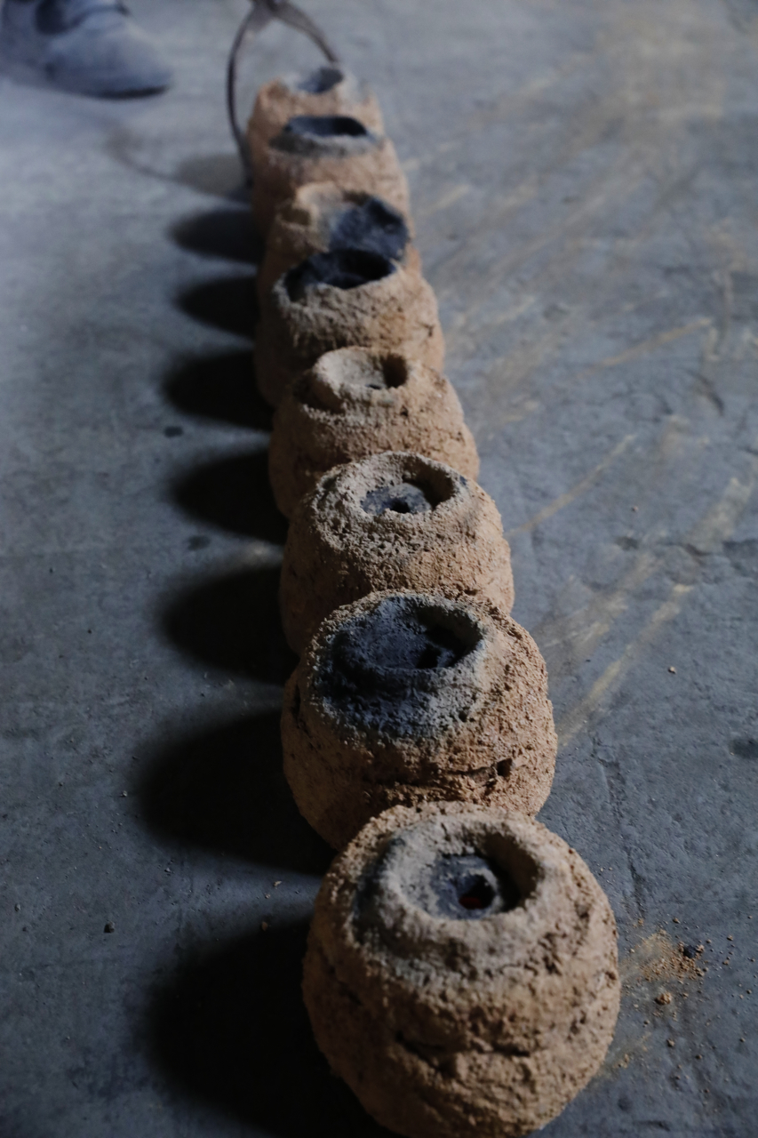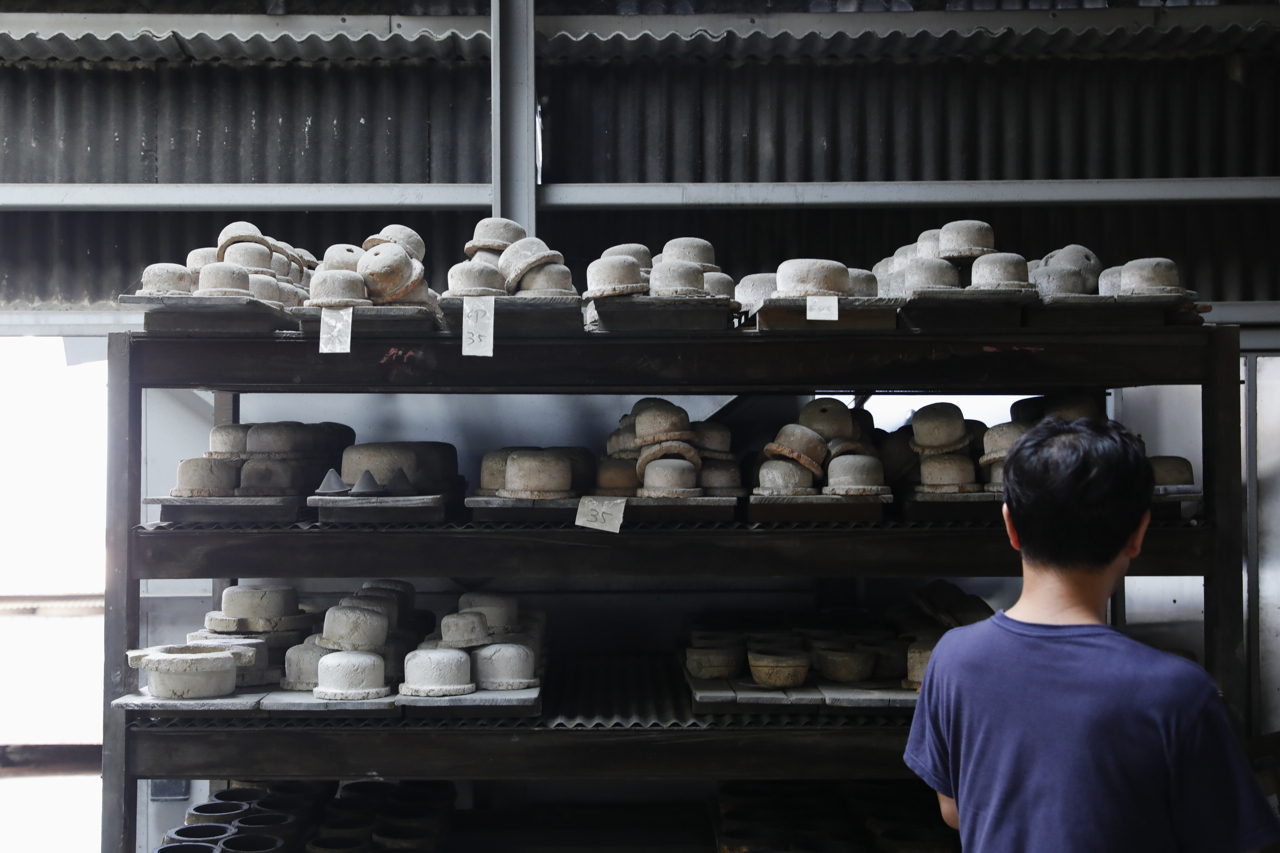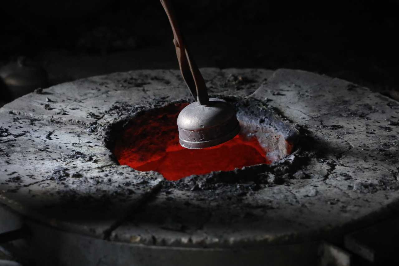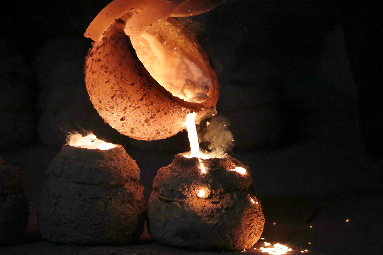 The studio uses 'Yakigata (burnt-mold) casting,' a traditional wood-fired method to cast its own unique blend of Sahari. In Yakigata casting, handmade clay molds are placed in a kiln, fired over a wood fire, cooled down to an appropriate temperature and then filled with molten Sahari. The temperature and the timing of all the processes are determined by the experience and intuition of the craftspeople who carry out each step in the scorching heat. The reason for the long and painstaking preservation of the traditional method is that the traditional wood-fired Yakigata casting method is considered to be the most suitable for casting Sahari. The studio has a pride and belief in creating unique sounds that reach deep into people's hearts and minds.