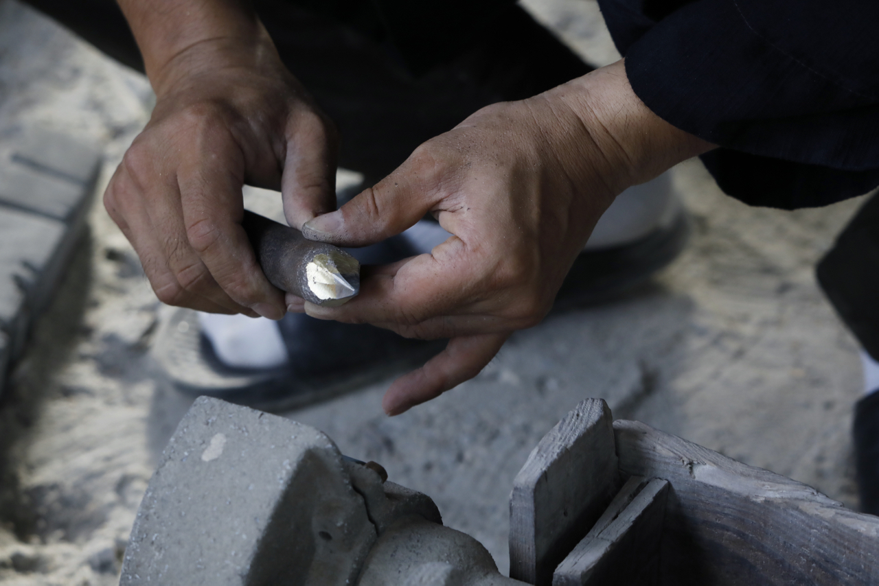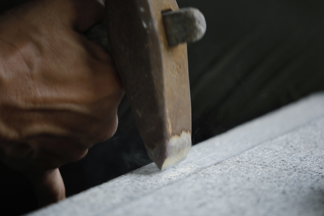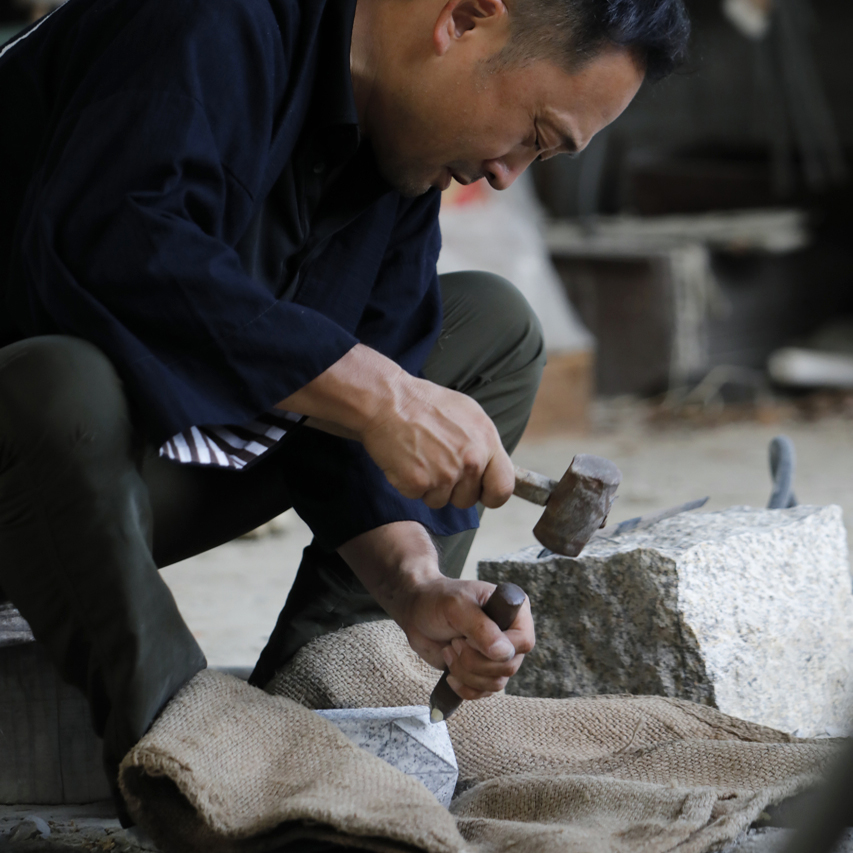 At first glance, the process of turning a stone into a work of art may seem unspectacular. However, the process is full of craftspeople's cultivated skills and philosophy of craftspersonship. When making a stone work, the stone is shaped little by little with a chisel, hammer and stone head. Depending on the work, it takes about two months to produce one stone lantern as tall as a Japanese person. Each day, the craftspeople face the stone in front of them and shape it little by little to create a beautiful form. The art of finishing a Kyo-Toro lantern requires delicate control of tools and a sense of aesthetics.