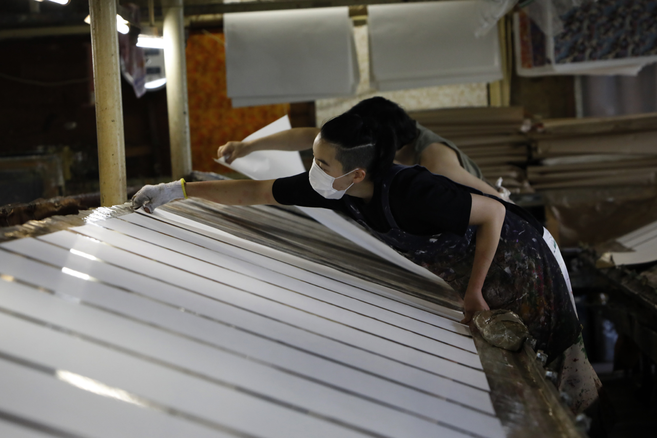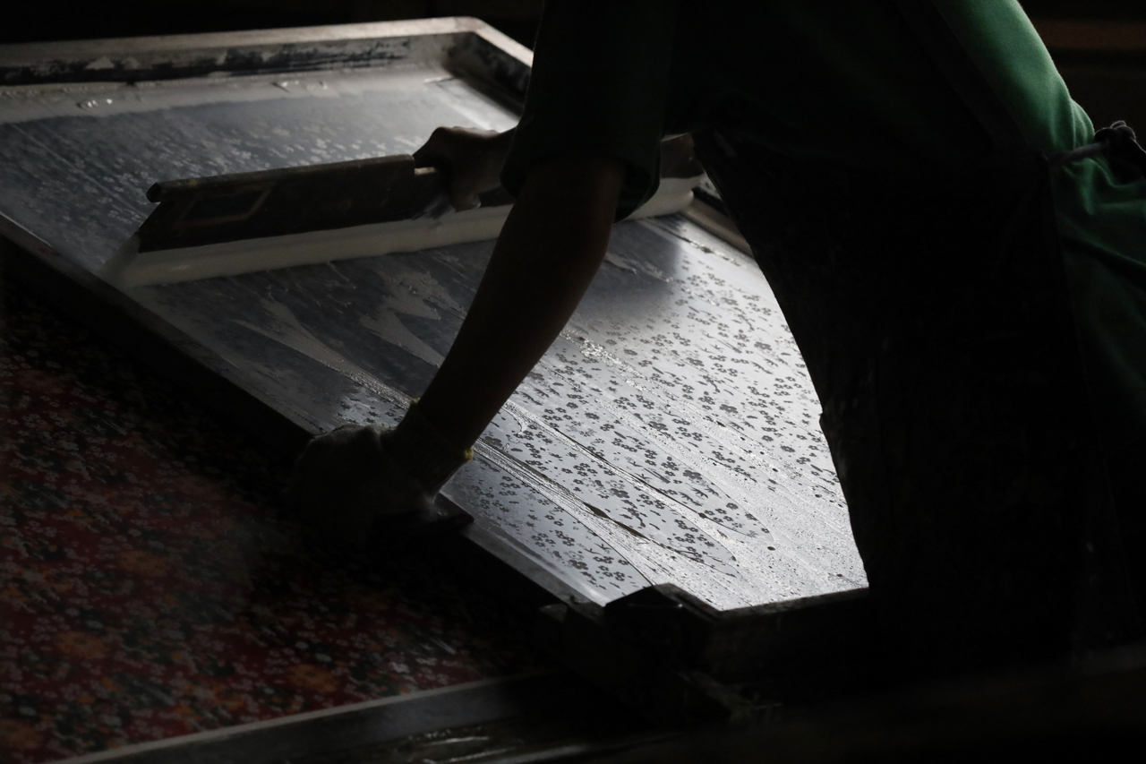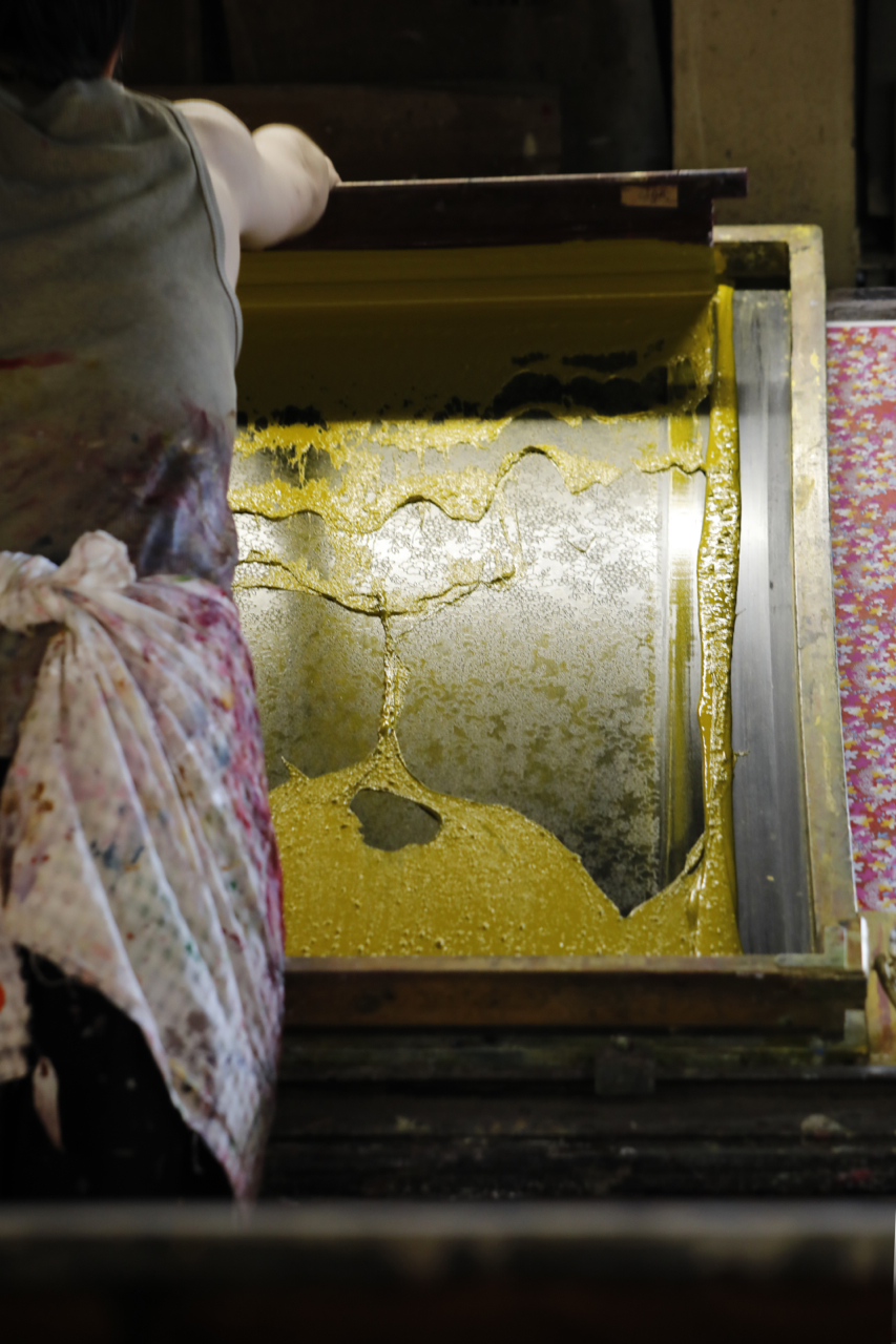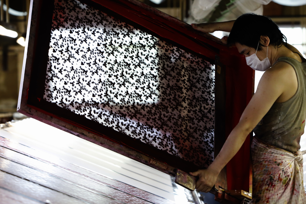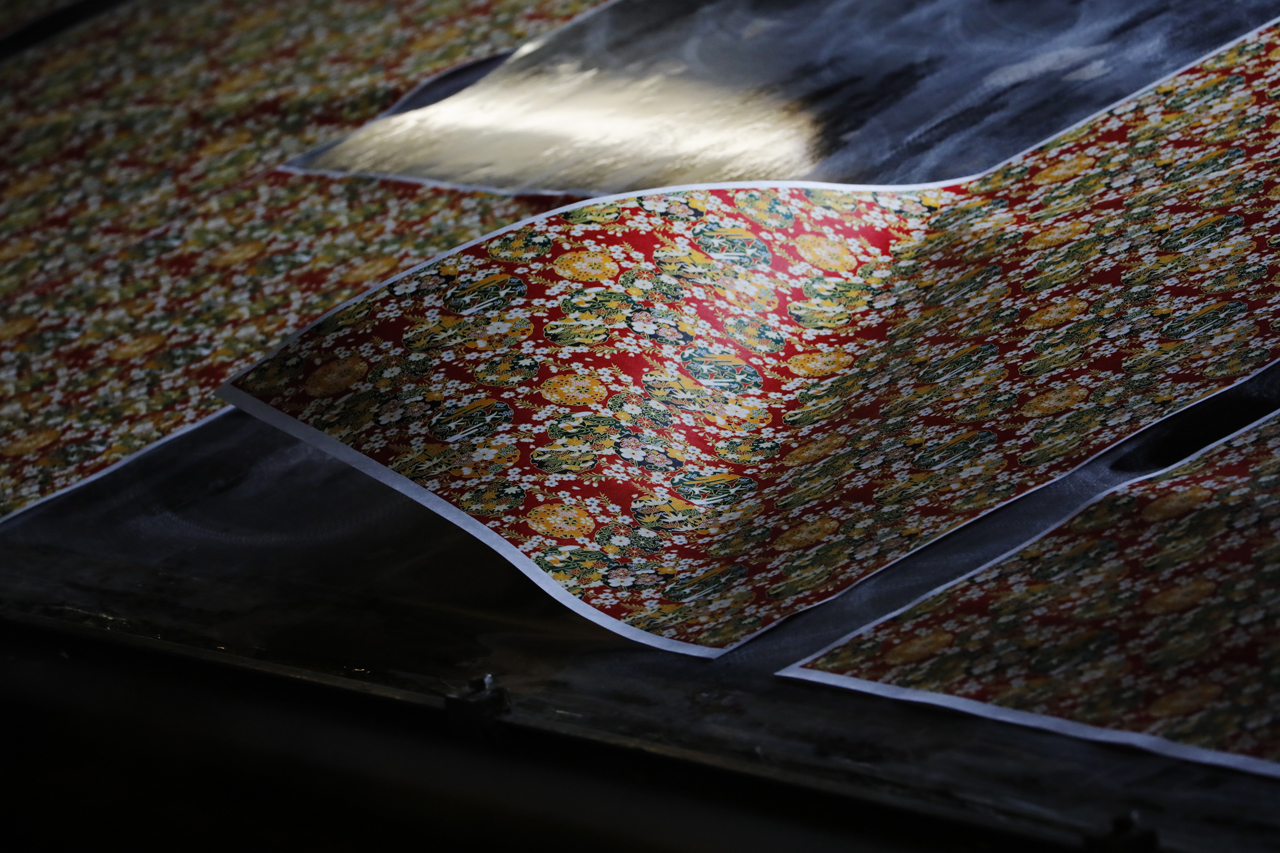 In the workshop of Maruyama Senko, where the printing work is carried out, craftspeople divide up the work, one sheet and one color. The workshop can print approximately 240 sheets at a time, but if, for example, six colors of ink are used to create a single work, the mould is set with ink, printed with a spatula and removed from the mould a total of 1,440 times, so fast and accurate work is required at all times. The process is extremely delicate and results in beautiful, luxurious washi paper.