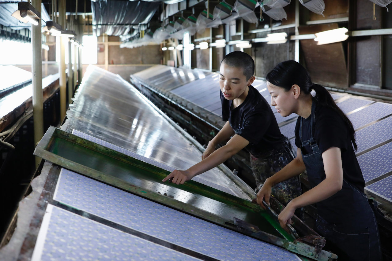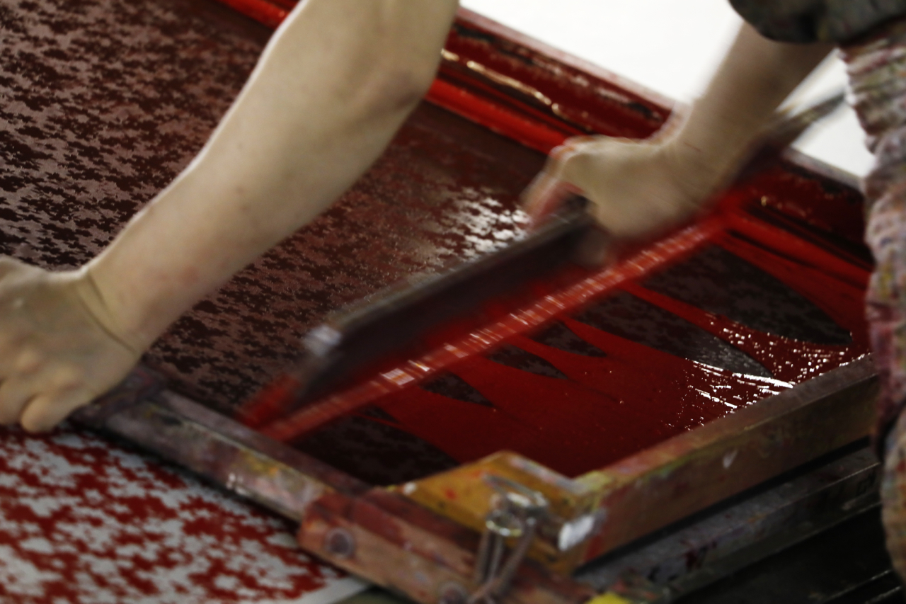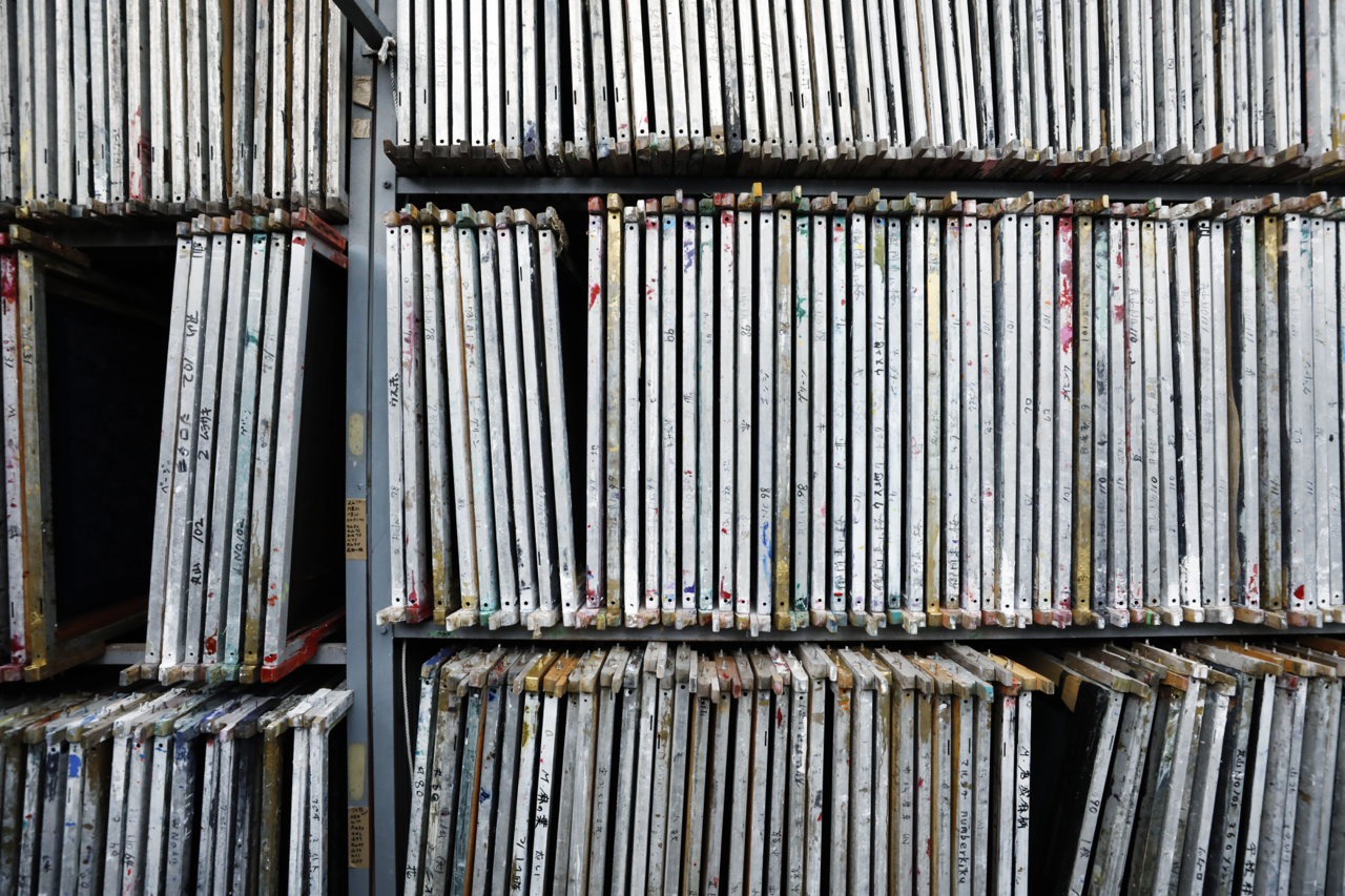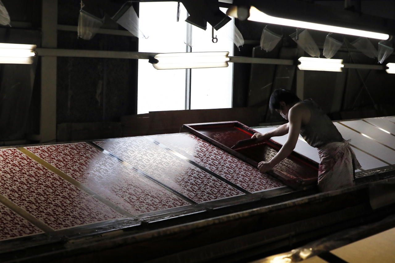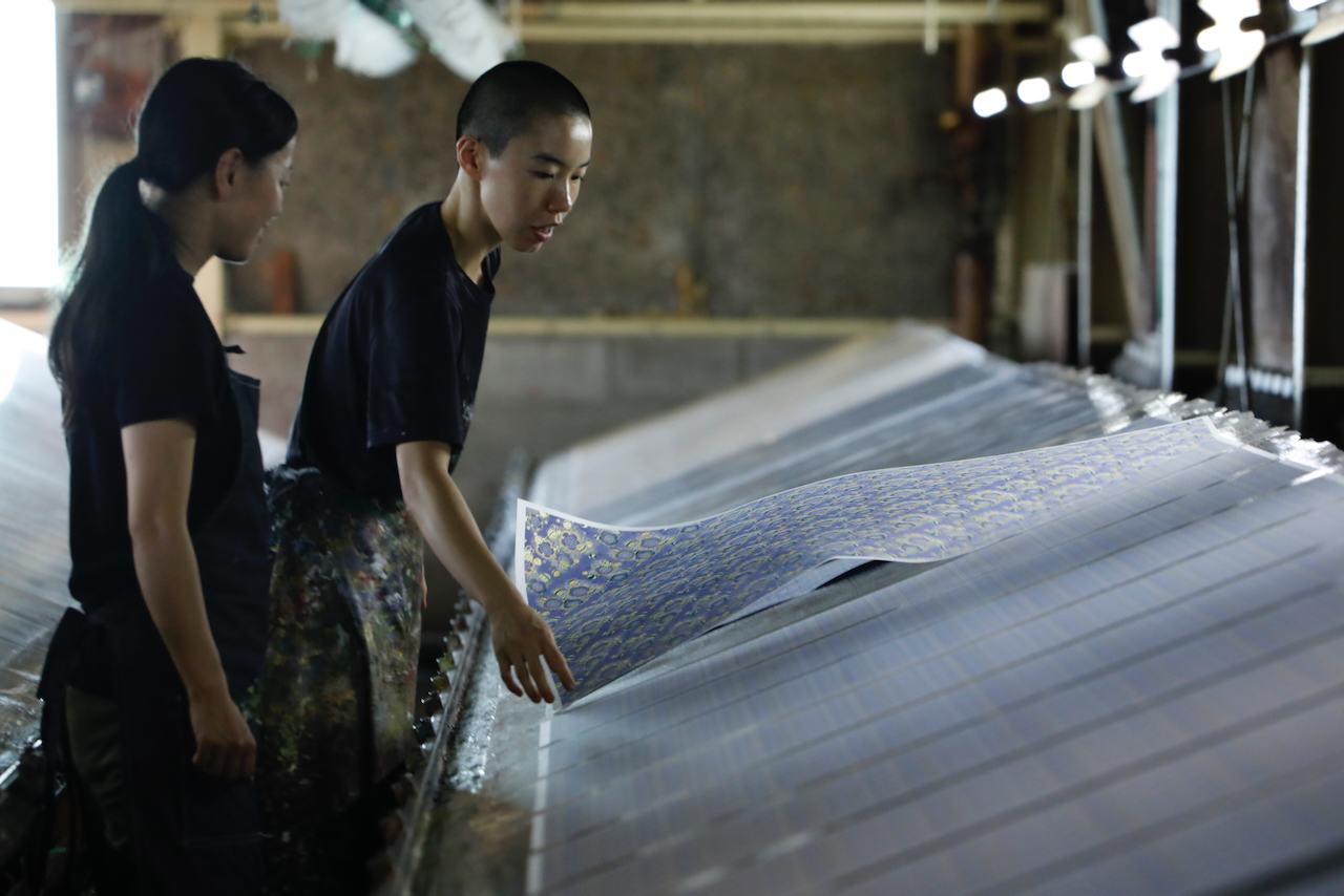 In the workshop of Maruyama Senko, where the printing work is carried out, craftspeople divide up the work, one sheet and one color. The workshop can print approximately 240 sheets at a time, but if, for example, six colors of ink are used to create a single work, the mould is set with ink, printed with a spatula and removed from the mould a total of 1,440 times, so fast and accurate work is required at all times. The process is extremely delicate and results in beautiful, luxurious washi paper.