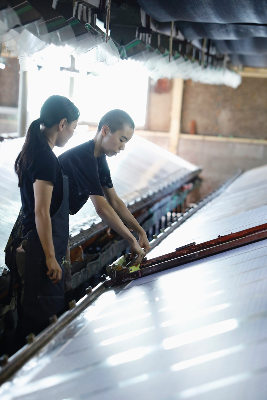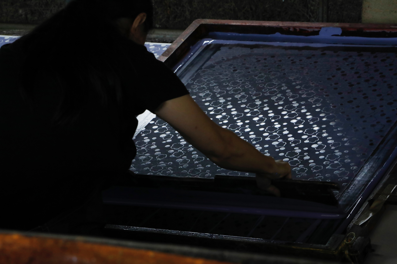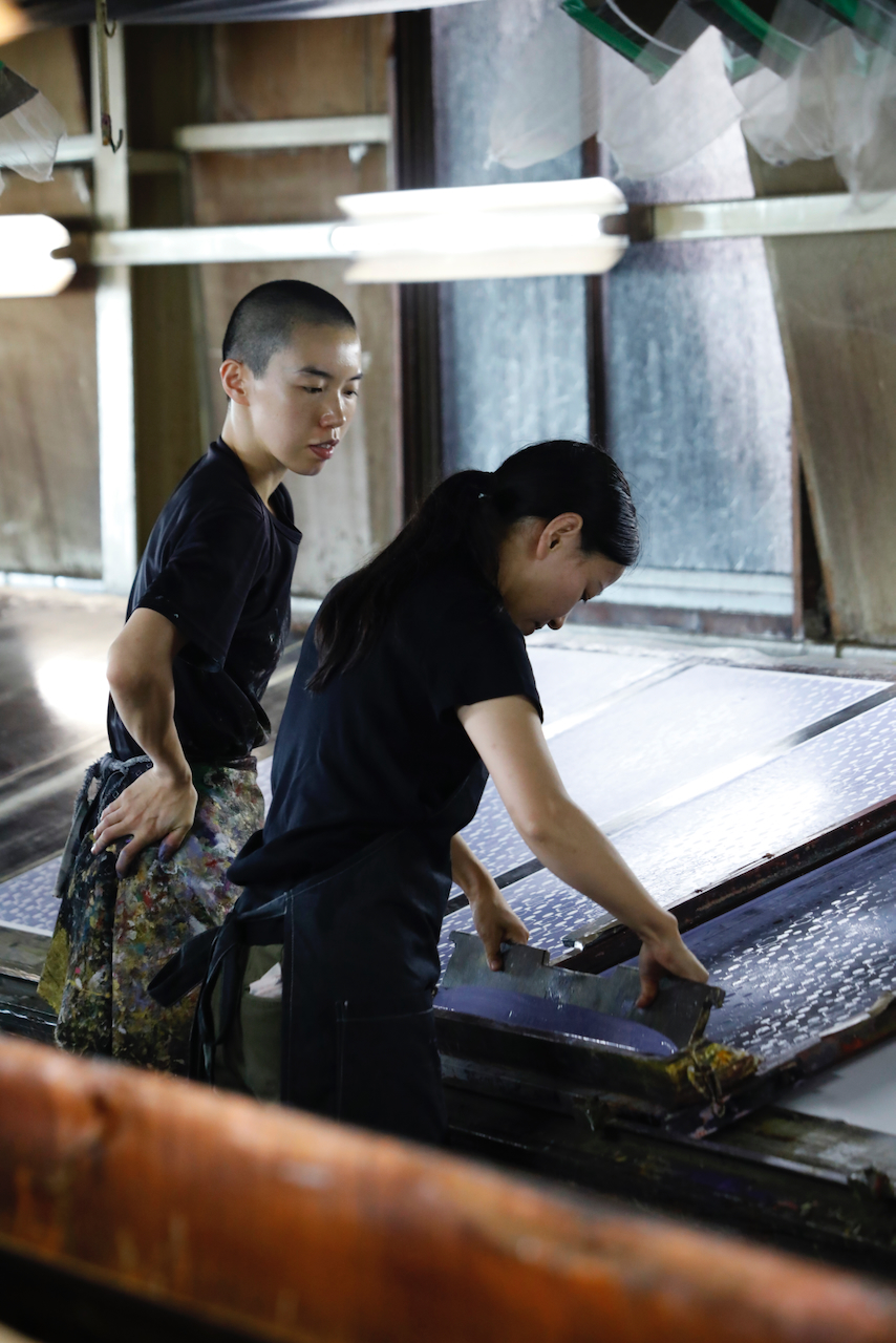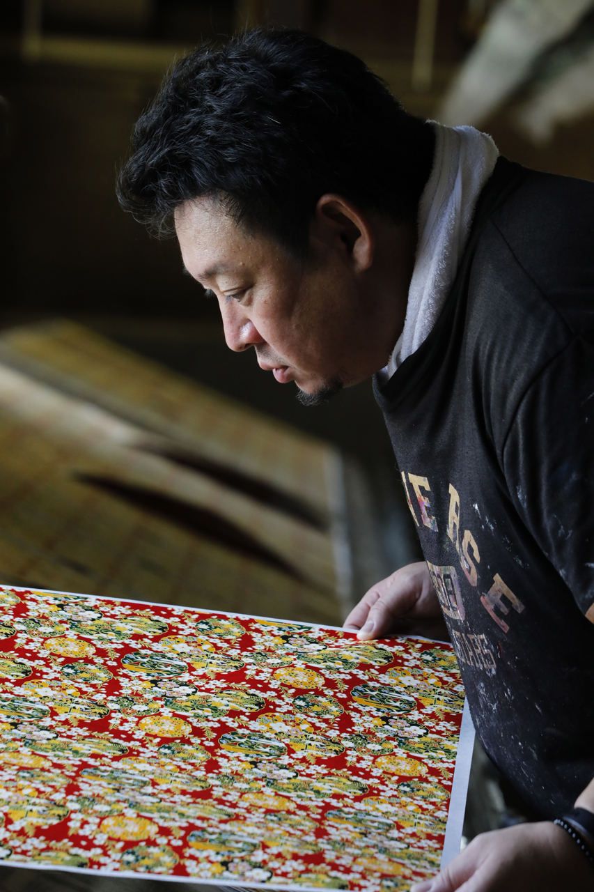 In the workshop of Maruyama Senko, where the printing work is carried out, craftspeople divide up the work, one sheet and one color. The workshop can print approximately 240 sheets at a time, but if, for example, six colors of ink are used to create a single work, the mould is set with ink, printed with a spatula and removed from the mould a total of 1,440 times, so fast and accurate work is required at all times. The process is extremely delicate and results in beautiful, luxurious washi paper.