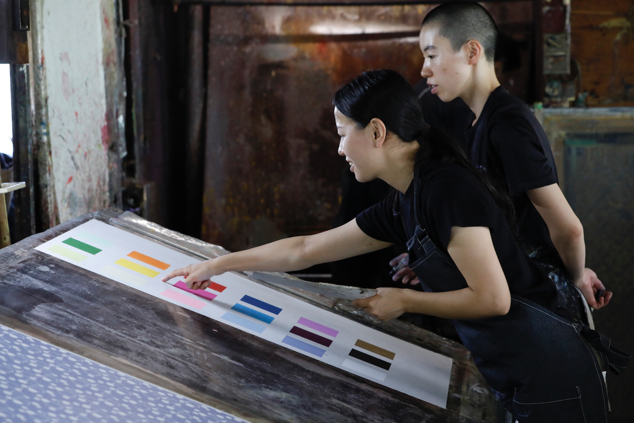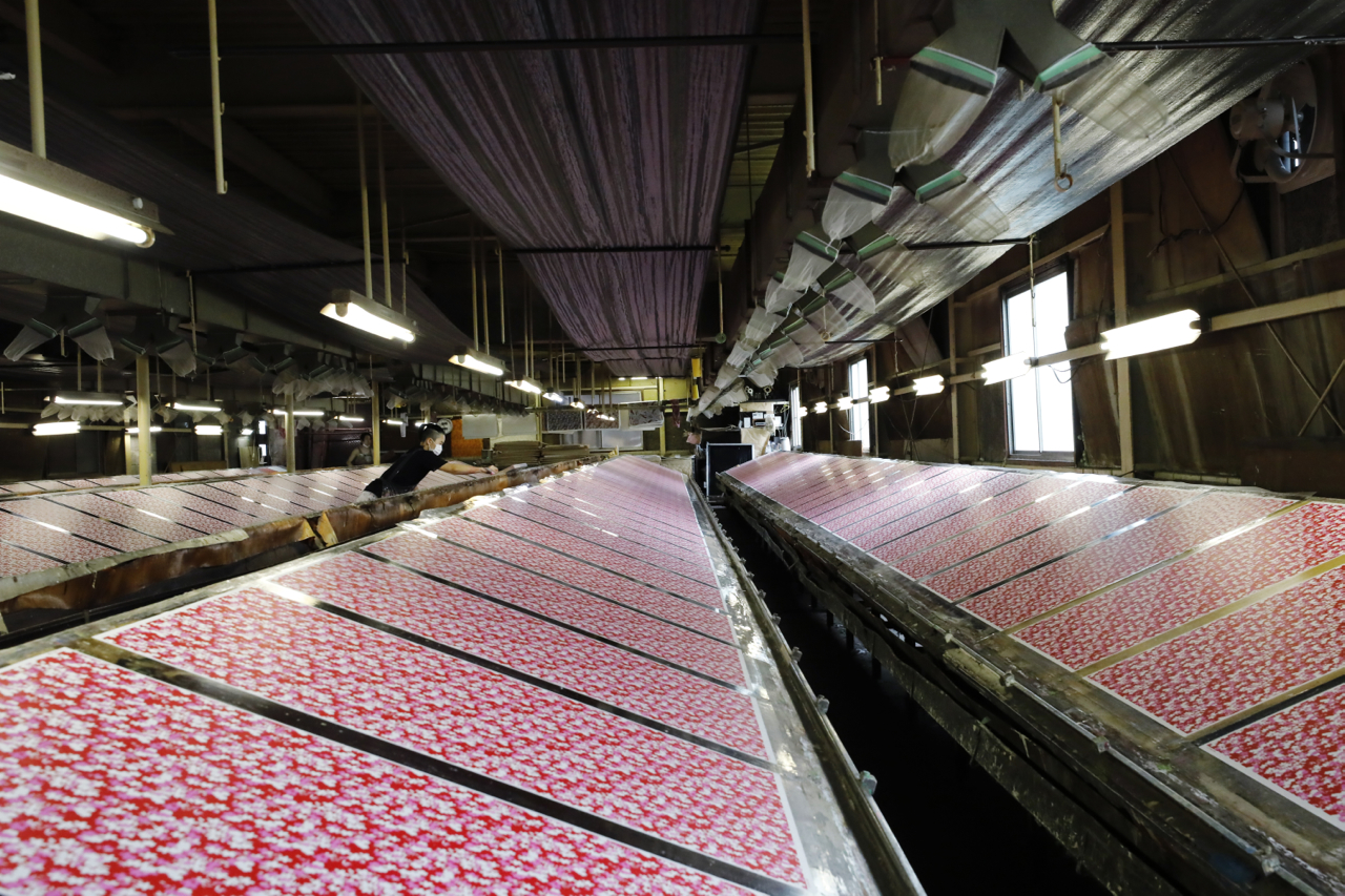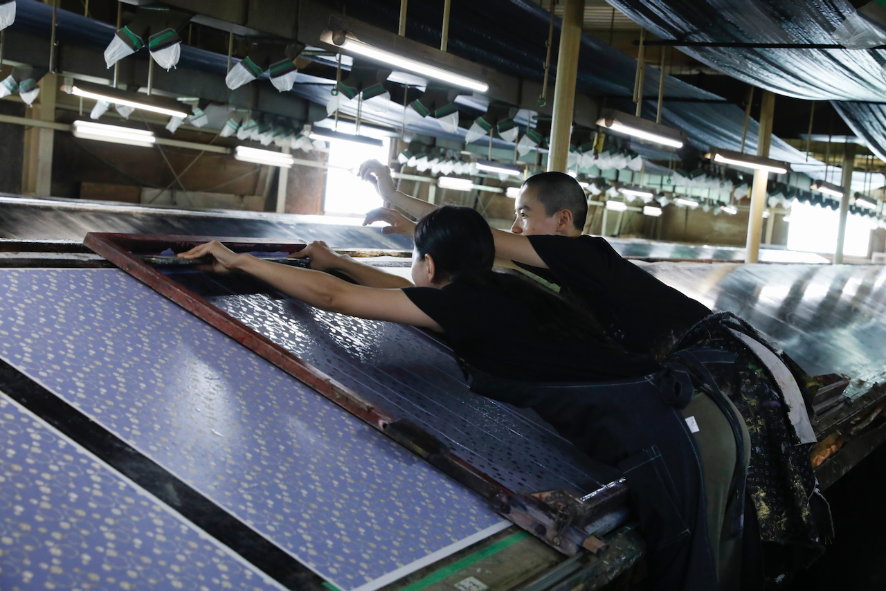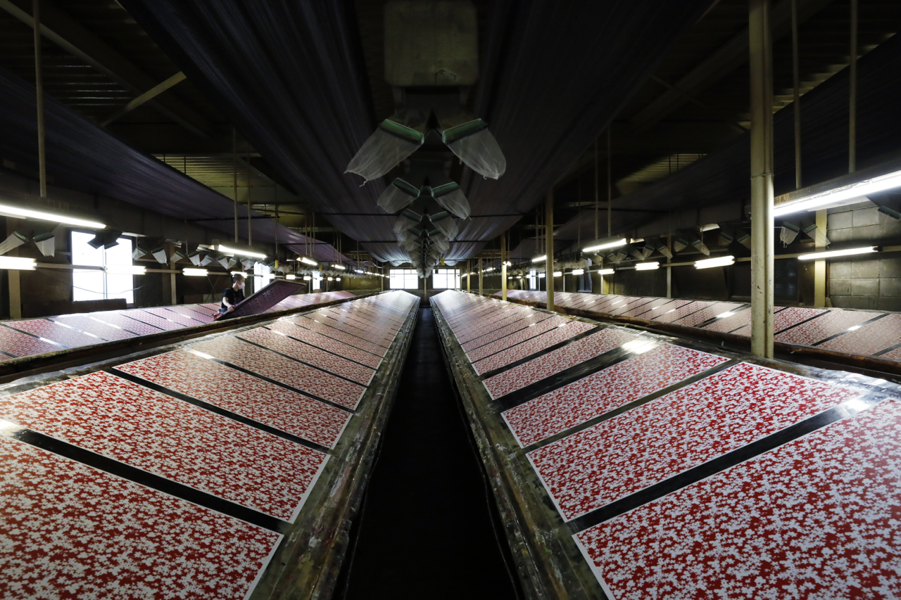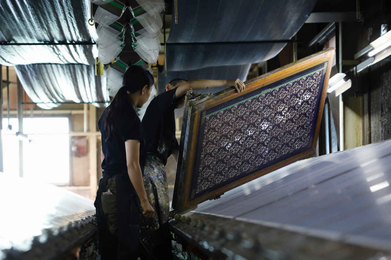 In the workshop of Maruyama Senko, where the printing work is carried out, craftspeople divide up the work, one sheet and one color. The workshop can print approximately 240 sheets at a time, but if, for example, six colors of ink are used to create a single work, the mould is set with ink, printed with a spatula and removed from the mould a total of 1,440 times, so fast and accurate work is required at all times. The process is extremely delicate and results in beautiful, luxurious washi paper.