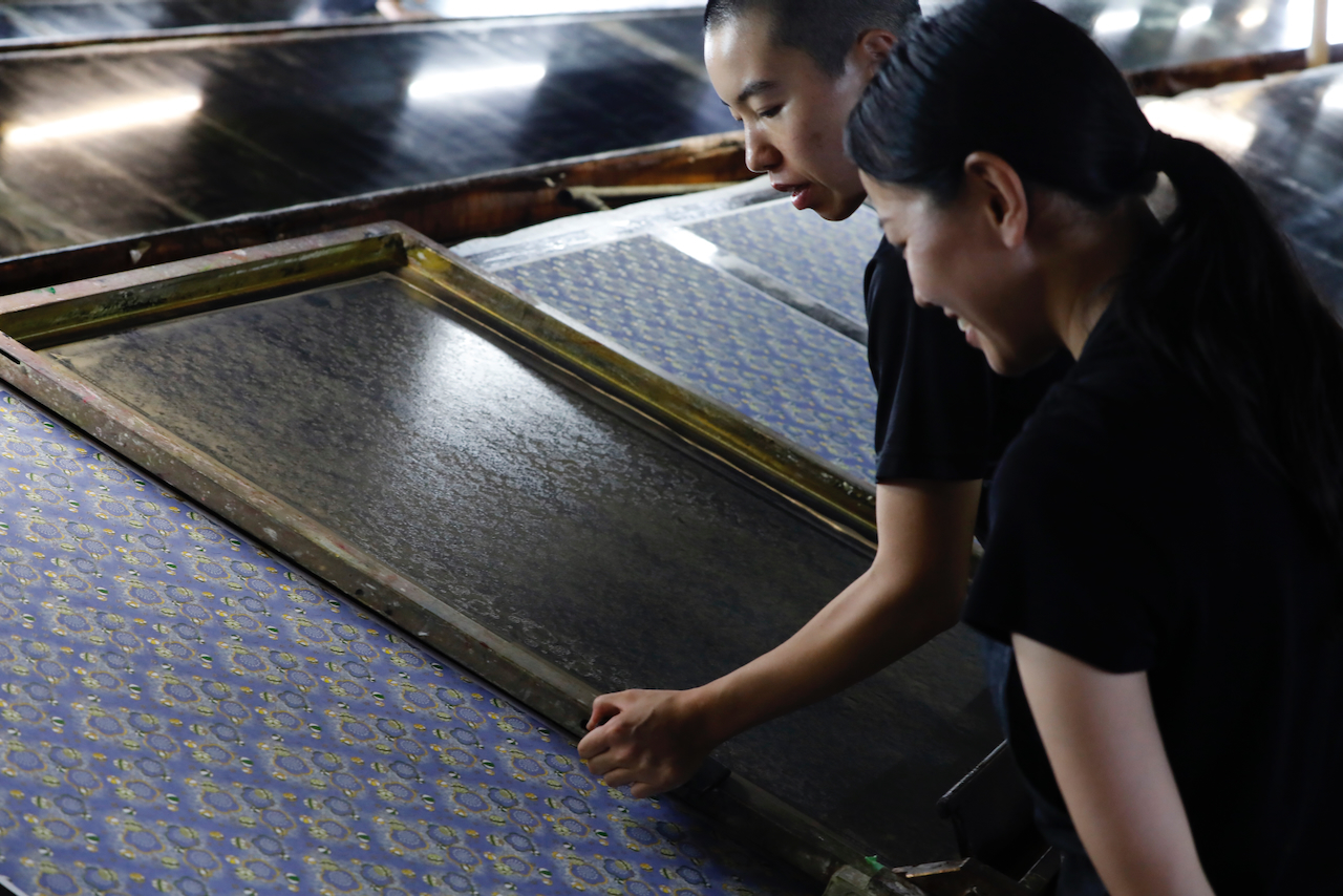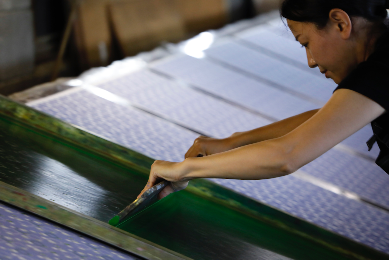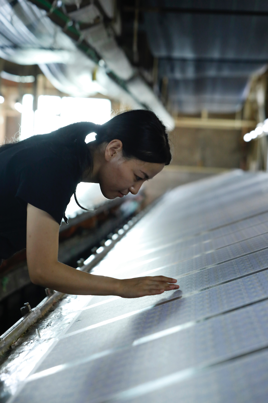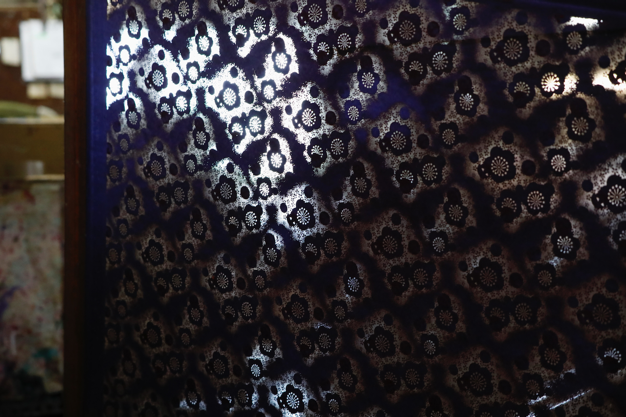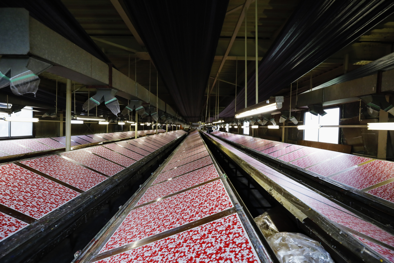 In the workshop of Maruyama Senko, where the printing work is carried out, craftspeople divide up the work, one sheet and one color. The workshop can print approximately 240 sheets at a time, but if, for example, six colors of ink are used to create a single work, the mould is set with ink, printed with a spatula and removed from the mould a total of 1,440 times, so fast and accurate work is required at all times. The process is extremely delicate and results in beautiful, luxurious washi paper.