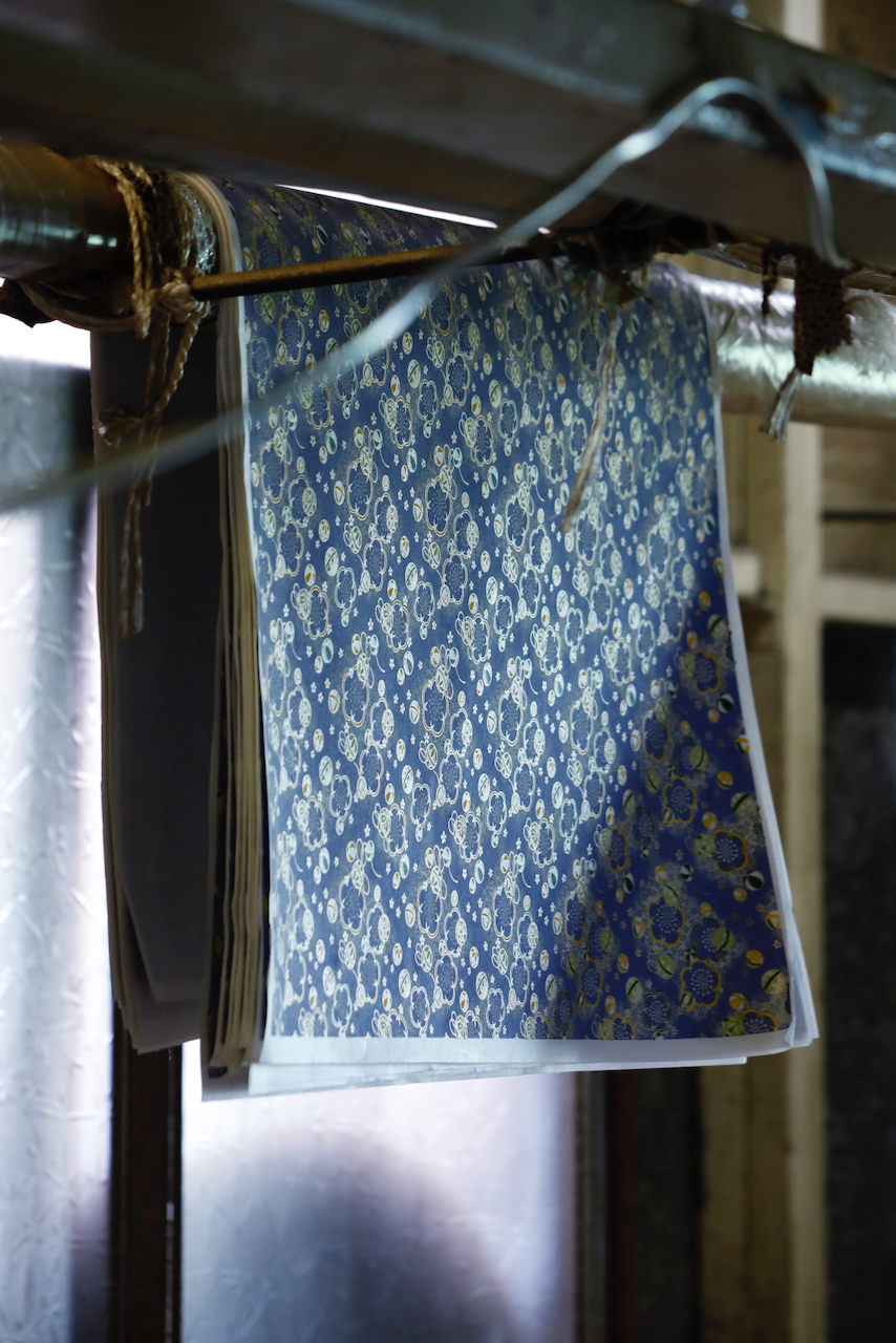 Maruyama Senko is a workshop that has been offering Kyo-yuzen, which is said to have been invented by Miyazaki Yuzenzai in the Genroku era (1688-1704), in the form of Kyo-yuzen Washi paper for about 30 years. Originally, Kyo-yuzen was dyed on fabric, but the president, Mr Maruyama, switched from fabric to washi using his skills, produced original yuzen patterns and started selling them as chiyogami and yuzen washi. When you enter the workshop, you will find lanes lined with washi. Yuzen washi is handmade by craftspeople who use moulds and carefully dye the paper one by one to avoid deformation of the pattern.